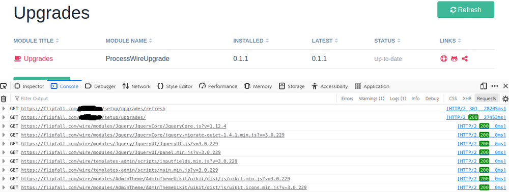 Thank you @BitPoetfor helping untangle this tangled mess. Glad the SchedulePages message is normal. To follow up on your suggestions, I looked at the server logs, although that unfortunately only gives me incoming connections. I also tried loading the Upgrades page with F12 on the browser to see what was happening. Both the server logs (not shown here for the sake of simplicity) and the browser F12 (pic below) show the same thing, which is that the main request takes ages, but everything else seems fine: You will notice that there is a warning and a log entry flagged on the pic above, but if we look at these they don't seem like anything important (although that's beyond me): Since I'm on a shared server, I can see my own server logs of incoming requests but that's it. I can't see where outgoing http(s) requests are going. I think you must be right that there is some DNS lookup problem or an issue with certain types of outgoing connections at my web host, but it looks like it won't be possible for me to track that down. I'm puzzled because I don't know why this suddenly started yesterday - I hadn't made any changes just before I logged in that morning, no changes to my templates either. In other words I don't know why this problem just cropped up out of the blue yesterday. (I think it was yesterday - it may have been the day before, but I think yesterday). My standard outgoing links (e.g. front-facing pages on my blog site that link to an external site) are working fine and seem to be resolving normally and at a normal speed. Thank you, it helped to have an idea what to look at. I think at this point I may have to just accept the lengthy login time, unless you or anyone else can think of anything else that I should look at. Thank you for your time on this problem, it is much appreciated.