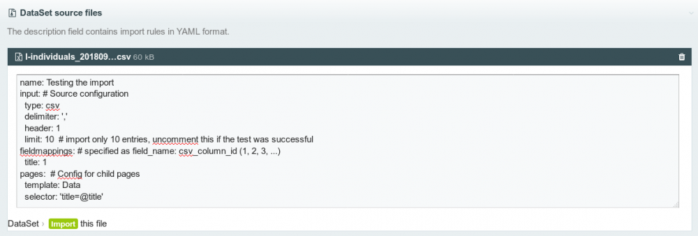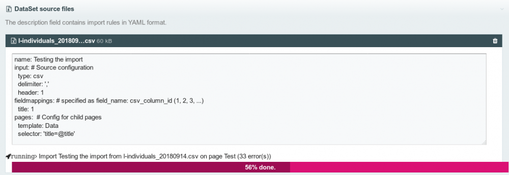I've created a set of modules for importing (manipulating and displaying) data from external resources. A key requirement was to handle large (100k+) number of pages easily. Main features import data from CSV and XML sources in the background (using Tasker) purge, update or overwrite existing pages using selectors user configurable input <-> field mappings on-the-fly data conversion and composition (e.g. joining CSV columns into a single field) download external resources (files, images) during import handle page references by any (even numeric) fields How it works You can upload CSV or XML files to DataSet pages and specify import rules in their description. The module imports the content of the file and creates/updates child pages automatically. How to use it Create a DataSet page that stores the source file. The file's description field specifies how the import should be done: After saving the DataSet page an import button should appear below the file description. When you start the import the DataSet module creates a task (executed by Tasker) that will import the data in the background. You can monitor its execution and check its logs for errors. See the module's wiki for more details. The module was already used in three projects to import and handle large XML and CSV datasets. It has some rough edges and I'm sure it needs improvement so comments are welcome.