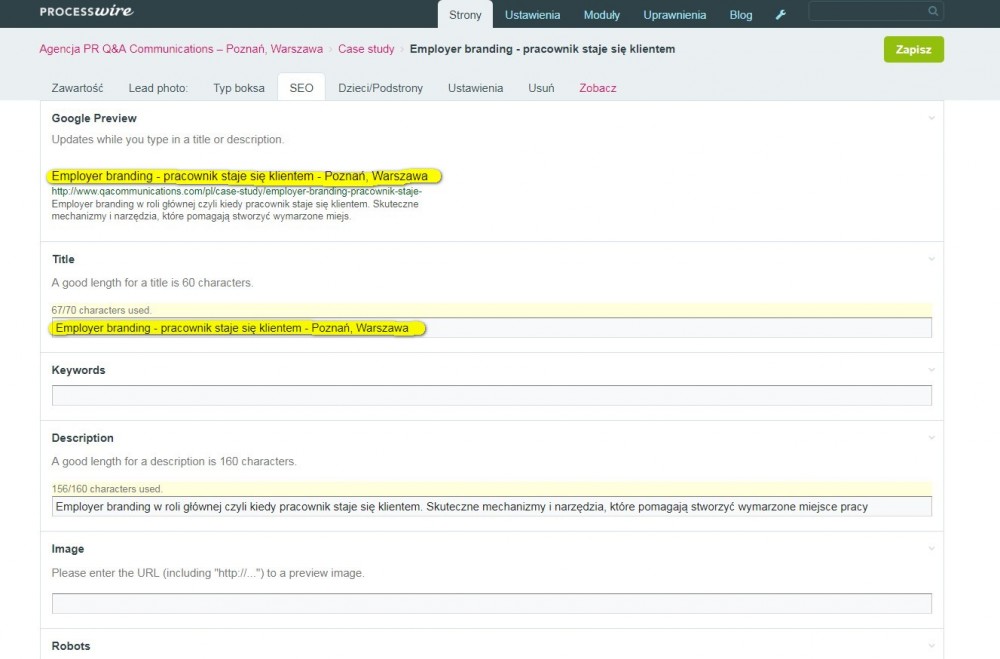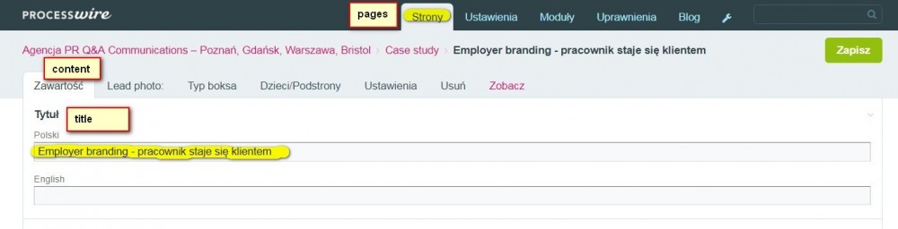 Meta tag title is not allways the same as title. here http://www.qacommunications.com/pl/case-study/employer-branding-pracownik-staje-sie-klientem/ The title is Employer branding - pracownik staje się klientem And the Meta title tag is Employer branding - pracownik staje się klientem - Agencja PR Q&A Communications – Poznań, Gdańsk, Warszawa, Bristol .........which is too long The processwire is adding automatically - Agencja PR Q&A Communications – Poznań, Gdańsk, Warszawa, Bristol I want to set up a title tag manualy for each page for SEO reasons.