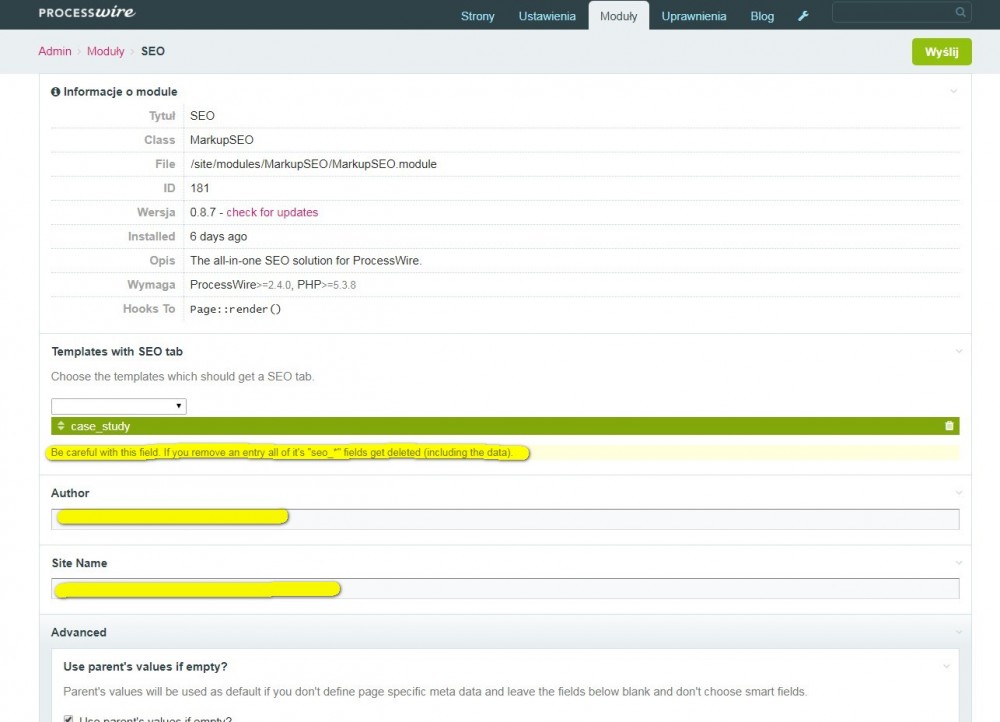 Can I revive the subject ? I want to use this module for a website I inherited, (I didn't use the processwire before) There is one thing that makes me uncertain. In: Choose the templates which should get a SEO tab There is a note Be careful with this field. If you remove an entry all of it's "seo_*" fields get deleted (including the data). Is there any risk there An do I have to type in the Author and Sitename? -