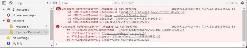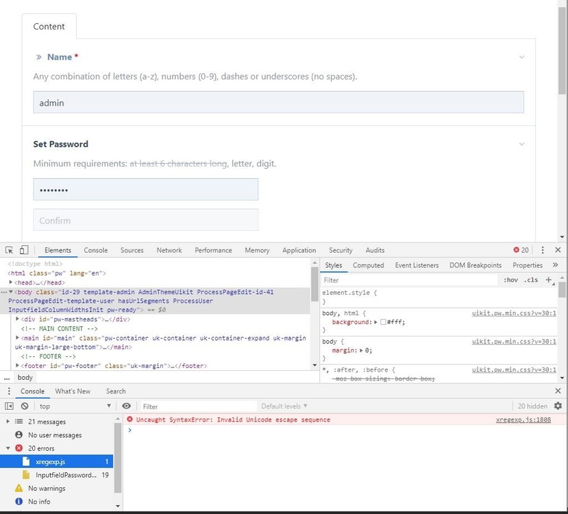 *Now fixed, please ignore* ------------------------------ My site has English and Thai language (not sure if relevant). The live version of the site works fine, but in my local version (using XAMPP) I cannot change the admin password as the password confirmation field is greyed out (similarly I can't create a new user). Chrome's console shows this: Here's line 1808: The console also shows this: Both the local and live databases appear to have collation generally set to utf8_general_ci, and the field_pass columns set to ascii_general_ci. Maybe the below is the issue? Local: Live: