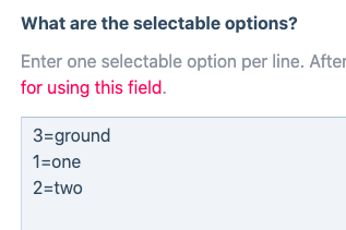 The default IDs created for a Select Fieldtype seem to start from the numerical digit of 1. However, we're supposed to be able to define our own custom id and title values. In my case, I was trying to assign a value of zero as the ID assigned to the first title so that sort order could be properly maintained (floors of a building, where "ground" = 0). From my tests, with the standard Select Fieldtype, the ID is redefined automatically as the largest numerical value (ex: 0:ground, 1:floor 1, 2:floor 2, 3:floor 3 - ID for "ground" becomes 4). For the Combo field's internal value of a Select, its ID value ends up becoming null. I couldn't find if this is a documented and known limitation anywhere and am wondering if I'm just doing something silly. Trying to force the ID back to 0 will prompt the user to delete the associated entry. After trying to update the ID for "ground" to a numeric value of zero: