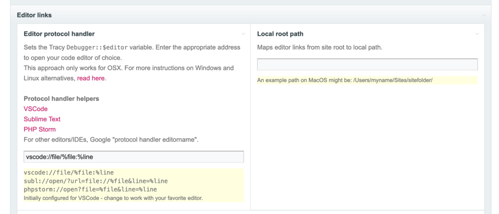 @adrian I tried to set Editor protocol handler: netbeans://open?file=%file&line=%line Local root path: /Users/<MyMacOSUserName>/NetBeansProjects/<MyProjectFolder>/ That in the Tracy panel outputs the link (which seems to be correct) as follows: netbeans://open?file=/Users/<MyMacOSUserName>/NetBeansProjects/<MyProjectFolder>/site/templates/template-name.php&line=139 But when I click on the link in the Tracy panel, NetBeans doesn't open and in the browser console I get the error message: Failed to launch 'netbeans://open?file=netbeans://open?file=/Users/<MyMacOSUserName>/NetBeansProjects/<MyProjectFolder>/site/templates/template-name.php&line=139' because the scheme does not have a registered handler. There is no guide about NetBeans for Mac. Probably NetBeans and/or Mac aren't configured well. ? -