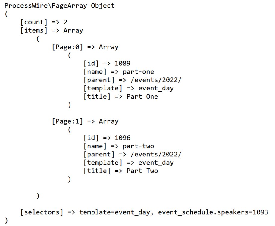 3. I can't find anything specific in my searches, so I figured I would ask for some guidance! So I have a repeater field that I'm trying to search for outside a page. Here's my structure: Home Events (events template) Event (event template) Part One (event_day template) Repeater (named event_schedule) Event Start Date (event_start_date) etc... Part Two etc... Speakers (speakers template) So from the speakers template I'm trying to access the repeater with the following: $pages->find("template=event_day, event_schedule.speakers={$page->id}"); How do I access the actual fields inside the repeater, for example, the above dumps the following, which is correct, just can't access the event_start_date field? Let me know if there's more info needed. Thank you!