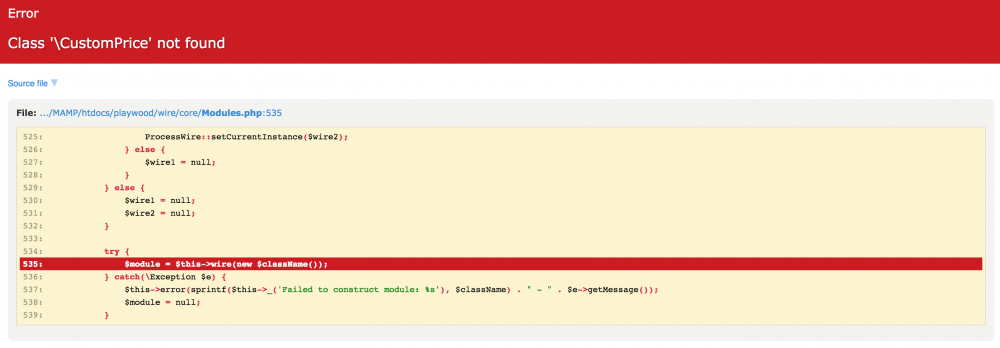 Hi guys, I installed the latest this version of PW the 3.0.96. I notice this error when I try to install a custom module: I try to install my module and this not works. But I also try to install the demo CustomPrices.module the on it's in the Padloper documentation and ugual doesn't work. So I think that maybe could be a bug of the new version. I use: php 7.1.8 in localhost with mamp, server Apache, and run the last version of PW the 3.0.96. Cheers