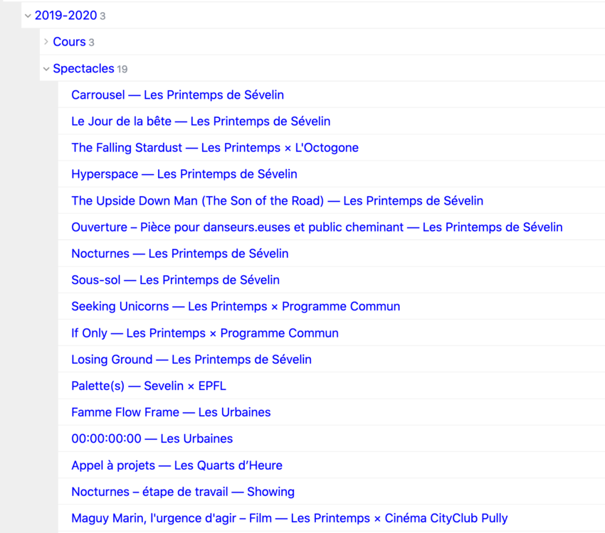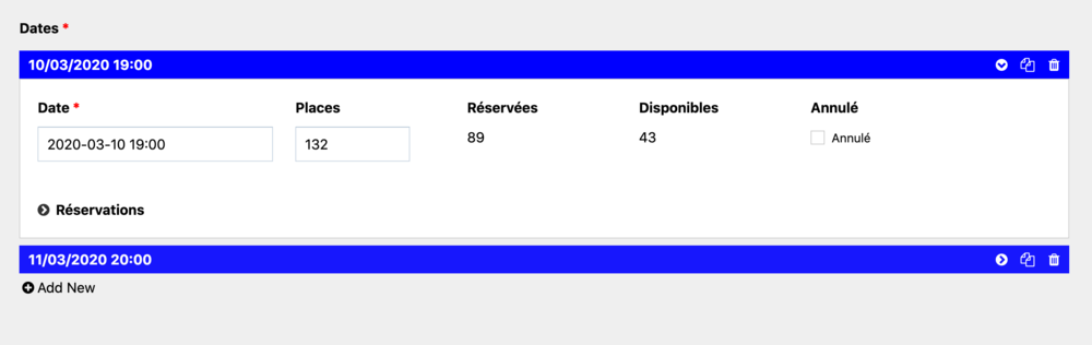Hello, I am working on a website for a theatre with a calendar of performances. I have a page (all events) which can have children (single event). The children have a repeater field called dates, where numerous dates and other information (number of seats etc) for that event can be set. One event may have three or four different dates. In the admin page list, I want to sort the children of the events page by the date of the first repeater. Setting the children sort order on the template of the events page to the dates field does not work, probably because the repeater has more fields other than just the date. Is there a hook I can use to sort the page list? Can I use ProcessPageList::execute? I would need to specifically target that one particular page and its children. In the screenshots below you can see the page list I want to sort (under Spectacles), and the dates repeater for each of those events. I hope my explanation is clear, Thanks for any help.