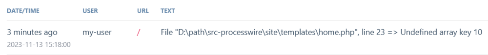 Hello, Recently, while debugging something, I found I had unsolved PHP warnings. Because I'm using Twig, PHP warnings are not displayed at top of page. Not being aware that we have warnings in our code is not acceptable. ?♂️ So I added this code in site/init.php: set_error_handler( function (int $errorNumber, string $message, string $file, int $lineNumber): bool { wire()->log->save('php-warnings', "Fichier \"$file\", ligne $lineNumber => $message"); // Return true so PHP won't process these warnings and display them at top of page. return true; }, E_WARNING); The log: Do you think it should be integrated in PW base installation, like errors and exceptions? If you have another way of managing this warnings, don't hesitate to share. ?