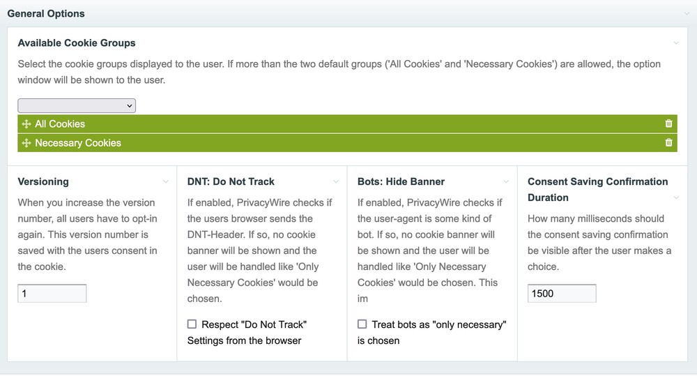 General Settings in PrivacyWire are only including the default "All Cookies" and "Necessary Cookies" and Piwik is still tracking after empty cache and click on "Necessary Cookies". Is data-category="statistics" included in "necessary"? I also tried data-category="necessary" but still tracking ... any idea? Website is this one