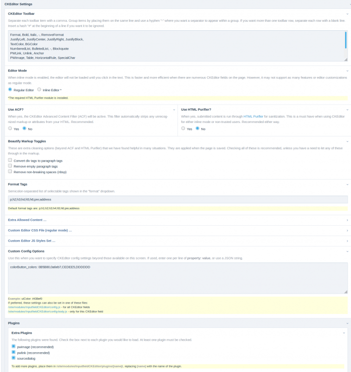 Hi there, Firstly my apologies if this has already been asked but I have searched both Google and these forums for an answer and haven't found something that matches exactly. I am building a site for a client and I would like them to be able to add and edit things without having to touch code at all...even if its having to go in and modify the html within ckeditor. I am currently adding in content to the site...just copying and pasting from a Libreoffice document, using the paste from word feature in ckeditor but it seems to add inline styles very frustratingly: <p style="margin-bottom:0cm"><span style="line-height:100%">Industry sectors represented at the show will include:</span></p> <p style="margin-bottom:0cm"> </p> <p style="margin-bottom:0cm"><span style="line-height:100%">Automotive, Aerospace, Construction, Marine, Energy, Electronics, Medical, Sports Equipment and Defence.</span></p> <p style="margin-bottom:0cm"> </p> <p style="margin-bottom:0cm"><span style="line-height:100%">Attendee job titles will include:</span></p> <p style="margin-bottom: 0cm; line-height: 100%"> </p> <table border="1" cellpadding="1" cellspacing="1" class="table table-content" style="width:100%;"> <thead> <tr> <th scope="col"> <p style="margin-bottom: 0cm; text-align: left;"><span style="line-height:100%"><font color="#000000"><font face="Calibri, serif">Application Development Engineer</font></font></span></p> </th> <th scope="col"> <p style="margin-bottom: 0cm; text-align: left;"><span style="line-height:100%"><font color="#000000"><font face="Calibri, serif">Materials Buyer</font></font></span></p> </th> <th scope="col"> <p style="margin-bottom: 0cm; text-align: left;"><span style="line-height:100%"><font color="#000000"><font face="Calibri, serif">Process Engineer</font></font></span></p> </th> </tr> </thead> <tbody> <tr> <td> <p style="margin-bottom:0cm"><span style="line-height:100%"><font color="#000000"><font face="Calibri, serif">Chief Executive Officer (CEO)</font></font></span></p> </td> <td> <p style="margin-bottom:0cm"><span style="line-height:100%"><font color="#000000"><font face="Calibri, serif">Materials Coordinator</font></font></span></p> </td> <td> <p style="margin-bottom:0cm"><span style="line-height:100%"><font color="#000000"><font face="Calibri, serif">Procurement</font></font></span></p> </td> </tr> Above is a sample of what ckeditor generates from me pasting. I dont want any inline styles. I dont want it to create spans with inline styles. Within the table it is adding font elements...I do not want these. I thought I have the settings within processwire set up correctly but apparently I do not. (See attached for my settings for this field). Any help would be greatly appreciated! Cleanboy