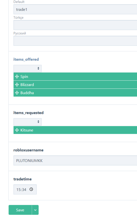 Here is my frontend form selecting multiple items. OFFERED ITEMS AND REQUESTED ITEMS here is my admin tree inside of the trade template admin panel i am using asm select. What i trying to do is when user select items from frontend form. I want to save that into trade page items_offered and items_requested asmselect as shown in the screen shot. i can do it for robloxusername with this code if ($input->post('robloxusername')) { $p = new Page(); $p->template = 'trade'; //or whatever your template is called $p->parent = wire('pages')->get('/trades/'); //or whatever the parent page is called $p->title = 'Form submission from ' . date('Y-m-d H:i'); $p->robloxusername = $input->post->text('robloxusername'); $p->save(); how can i do it to checkboxes ? Here is my form html <form method="POST" action="<?php echo $page->url; ?>" id="id01" class=" w3-container w3-black w3-text-light-grey w3-margin"> <span onclick="document.getElementById('id01').style.display='none'" class="w3-button w3-text-white w3-xlarge w3-display-topright">×</span> <div class="w3-row-padding w3-left w3-card w3-dark-grey w3-round w3-margin " > <h2 class="w3-center">WHAT DO YOU OFFER? SELECT MAX 4</h2> <?php $x=1?> <?php foreach ($pages->get('/en/items')->children as $r) {?> <div class="w3-center w3-col m3 l2 s4 w3-round " > <div class="cont-checkbox"> <input class="w3-check" type="checkbox" id="x<?php echo $x;?>" /> <label for="x<?php echo $x;?>"> <img class="responsive" src="<?php echo $r->image->url;?>"> <span class="cover-checkbox"> <svg viewBox="0 0 12 10"> <polyline points="1.5 6 4.5 9 10.5 1"></polyline> </svg> </span> <div class="info"> <?php echo $r->title;?></div> </label> </div> </div> <?php $x=$x+1;} ?> </div> <div class="w3-row-padding w3-left w3-card w3-dark-grey w3-round w3-margin " > <h2 class="w3-center">WHAT DO YOU REQUEST? SELECT MAX 4</h2> <?php $a=1?> <?php foreach ($pages->get('/en/items')->children as $m) {?> <div class="w3-center w3-col m3 l2 s4 w3-round " > <div class="cont-checkbox"> <input class="w3-checkreq" type="checkbox" id="a<?php echo $a;?>" /> <label for="a<?php echo $a;?>"> <img class="responsive" src="<?php echo $m->image->url;?>"> <span class="cover-checkbox"> <svg viewBox="0 0 12 10"> <polyline points="1.5 6 4.5 9 10.5 1"></polyline> </svg> </span> <div class="info"> <?php echo $m->title;?></div> </label> </div> </div> <?php $a=$a+1;} ?> </div> <div class="w3-col m12" > <div class="w3-container " > <div class="w3-row-padding w3-card w3-dark-grey w3-round w3-margin " > <input class="w3-input w3-border w3-xlarge " name="robloxusername" type="text" placeholder="ENTER ROBLOX USERNAME"> </div> </div> </div> <div class=" w3-center"> <input type="submit" value="Send" class="w3-button w3-xlarge w3-center w3-section w3-blue w3-ripple w3-padding"/> </div> </form>