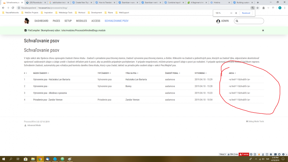 Hello, i just hit another problem. Maybe is very easy, but I can not find the place where I am having error. So I am doing some admin custom page - it shows requests from users for administrator. Administrator checks request and then should hit button approve or delete request. I am done this by creating table, and for each row in template I want to add also link with some data for GET. Problem is that table for some reason does not encode/render the link proper way - it only output html markup. (image 1, 2). Maybe I am missing something important? My relevant part of code below: <?php class ProcessRequests extends Process { public function init() { parent::init(); // required } public function ___execute() { $requests = new WireArray(); $match = $this->pages->find("template=request"); $requests->import($match); $requests->unique(); $requests->sort("-created"); $count = count($requests); if ($count) { $url = $this->config->urls->admin . 'page/edit/?id='; $table = $this->modules->get('MarkupAdminDataTable'); $table->setSortable(true); $table->setEncodeEntities(true); $table->headerRow(array( $this->_('#'), $this->_('Názov žiadosti'), $this->_('Typ žiadosti'), $this->_('Týka sa psa'), $this->_('Žiadosť podal'), $this->_('Vytvorená'), $this->_('Akcia'), )); foreach ($requests as $key => $u) { $mailer = $this->pages->get($u->request_mailer_id); $dog_ref = $this->pages->get($u->request_dog_reference->id); $table->row(array( $count - $key, $u->title => $url . $u->id, $u->request_type->title, $dog_ref->title => $url . $dog_ref->id, $mailer->name, date('Y.m.d - H:i', $u->created), "<a href=''>Schváliť</a>", )); } $out .= $table->render(); } else { $out .= "<p>" . $this->_("Well done, all dogs are edited.") . "</p>"; } return $out; } } Thanks for any replies :).
