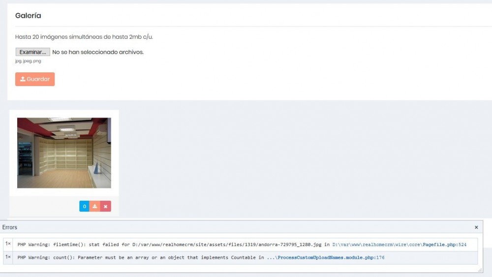 It worked. Thank you! Only this warning remaings but not sure why. PHP Warning: filemtime(): stat failed for D:/var/www/realhomecrm/site/assets/files/1319/andorra-729795_1280.jpg in D:\var\www\realhomecrm\wire\core\Pagefile.php:524