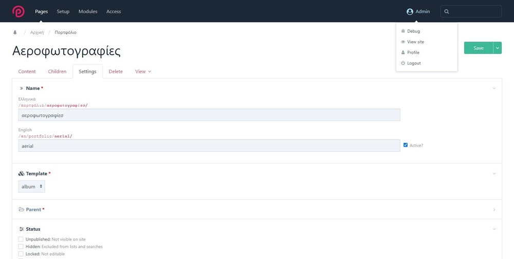 Hi all, greetings! OK another solution, adding here so I don't make the original post too long. So it turns out our client needs, except default language as Greek, also true Greek URLs not only "Greeklish" (as Greek in ascii chars was "baptized" before the UTF-8 wide adoption, from Greek+English). The great thing is that @ryan took care of that as shown here https://processwire.com/blog/posts/page-name-charset-utf8/ It requires ProcessWire 3.0.12+ as explained in the article, so if you're stuck with older versions for any reason, you can use the solution on the original post. We implemented already and it seems to work as expected on the testing server, still testing though. The Greek char mapping is absent from the Core still so adding here the steps we followed (retracing steps from above blog post, adding the Greek chars) 1. Add the following to your /site/config.php file. $config->pageNameCharset = 'UTF8'; $config->pageNameWhitelist = '-_.abcdefghijklmnopqrstuvwxyz0123456789æåäßöüđжхцчшщюяàáâèéëêěìíïîõòóôøùúûůñçčćďĺľńňŕřšťýžабвгдеёзийклмнопрстуфыэęąśłżźαάβγδεέζηήθιίϊκλμνξοόπρσςτυύφχψώω'; 2. In your .htaccess Locate directive 16a (near the bottom of the file) and comment it out by placing a # at the beginning of the line. What we are doing here is disabling the .htaccess limit on only allowing ASCII URLs to pass through to ProcessWire. Below the above directive (16a), you'll see directive 16b, which contains the alternative to the one you just commented out. Un-comment that directive by removing the # from the beginning of the line that it is on. This is what it looks like (minus the line wrapping): (ADDING HERE THE GREEK CHARS) RewriteCond %{REQUEST_URI} "^/~?[-_./a-zA-Z0-9æåäßöüđжхцчшщюяàáâèéëêěìíïîõòóôøùúûůñçčćďĺľńňŕřšťýžабвгдеёзийклмнопрстуфыэęąśłżźαάβγδεέζηήθιίϊκλμνξοόπρσςτυύφχψώω]*$" This is what the names and URLs look now: Cheers, Elissavet from Crowdland
