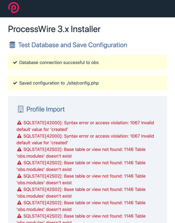 Hi everyone, having a similar issue installing PW 3.0.229 or 3.0.244. getting lots of SQLSTATE issues on installation of custom site (using site export module). php 8.2.27, compatability check all ticks, errors using both innoDB and myISAM but differently.