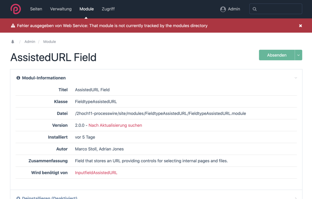 If I'm opening the Module Update Page (/processwire/module/?reset=2) there ist nothing to update: On the module page, if I hit "Look for an update" the backend outputs: "That module is not currently tracked by the modules directory":