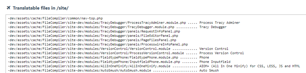 I followed the steps to use multiple-site in Processwire: https://processwire.com/docs/more/multi-site-support/ It works excellent but has issue with translations. It is easy to clone a production site to a dev site, simply duplicating the "site" dir to a "site-dev" dir. Then one needs to clone a database and that is it. Except for one thing - translations. Those are stored in assets/files/<language_id> with file names including the "site" (presuming I cloned the "site" dir). That can be for instance "site--templates--content--home-php.json". While working with the production site, everything looks great; once I use the dev site, I need to rename these files manually to "site-dev--templates--content--home-php.json" so Processwire can pick up the translation. I also noticed this while looking at the translations: The "-dev" at the beginning. Maybe trimming that would be more readable? I am not sure what solution would be the best here. Maybe having some variable in the LanguageSupport module that would allow ProcessWire to look for translation files with a different "site" name? Or a batch rename as the "site-" is always obligatory in order to use multiple-site feature? Maybe I missed someting though and there already is a setting for this though.