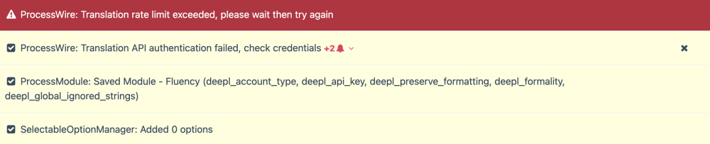 Error on a Fresh new installation: ProcessWire: Translation rate limit exceeded, please wait then try again. I recently came across this error which I really cannot explain... After trying with my usual API keys (well below the monthly limit) i also tried with new API relying on a new fresh account, but it returns the same error... On another site same api keys everything works correctly... The only difference is the Process Wire version. Any ideas? PhP 8.1 All requirements fulfilled. ProcessWire 3.0.246 (error site) ProcessWire 3.0.229 (No Error site with Fluency) The error occurs post selection of the translation engine and related API key input- 301 replies