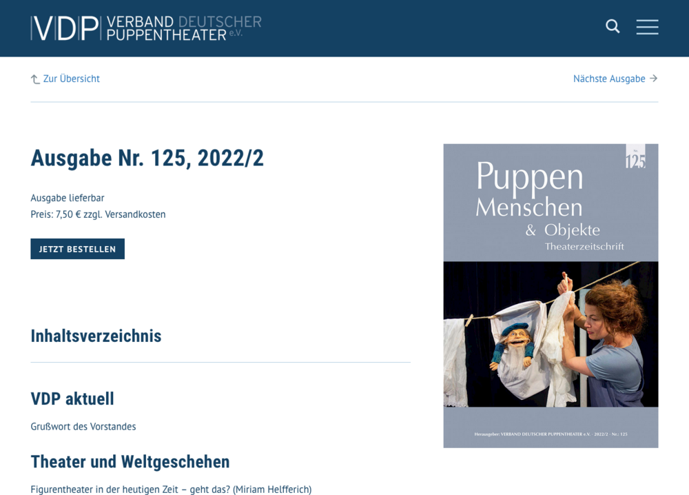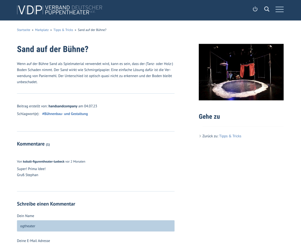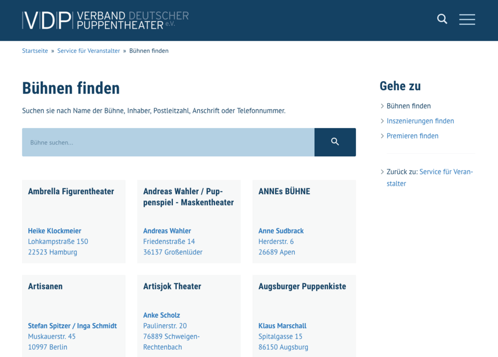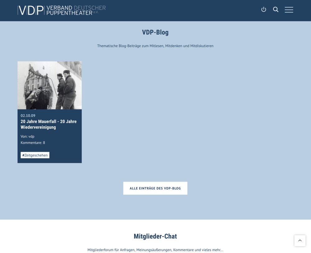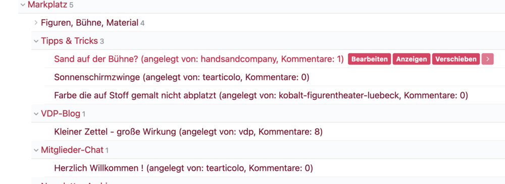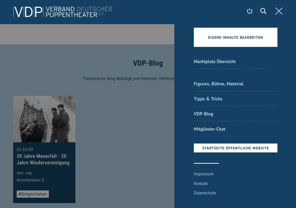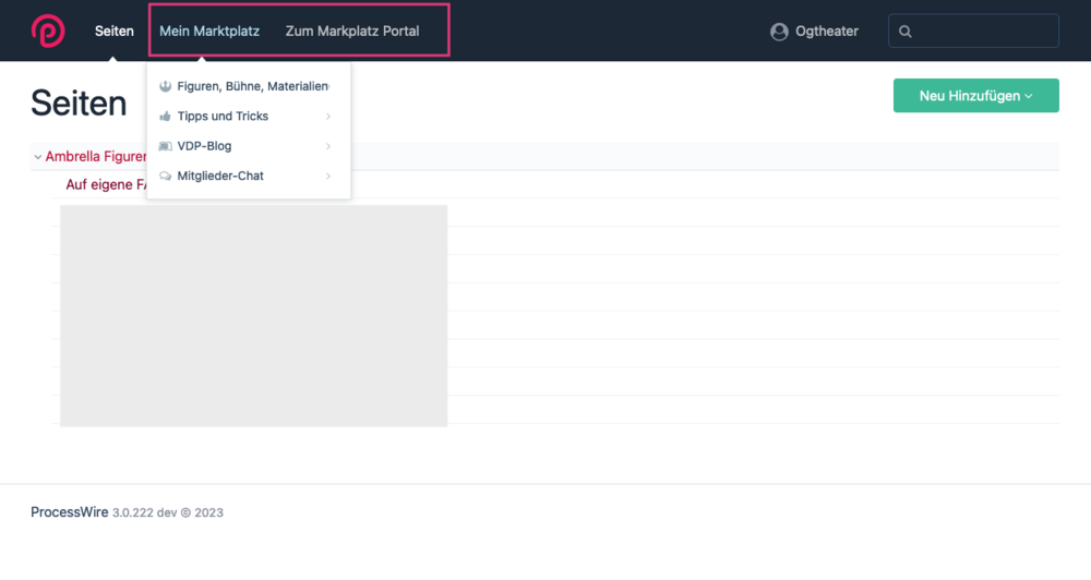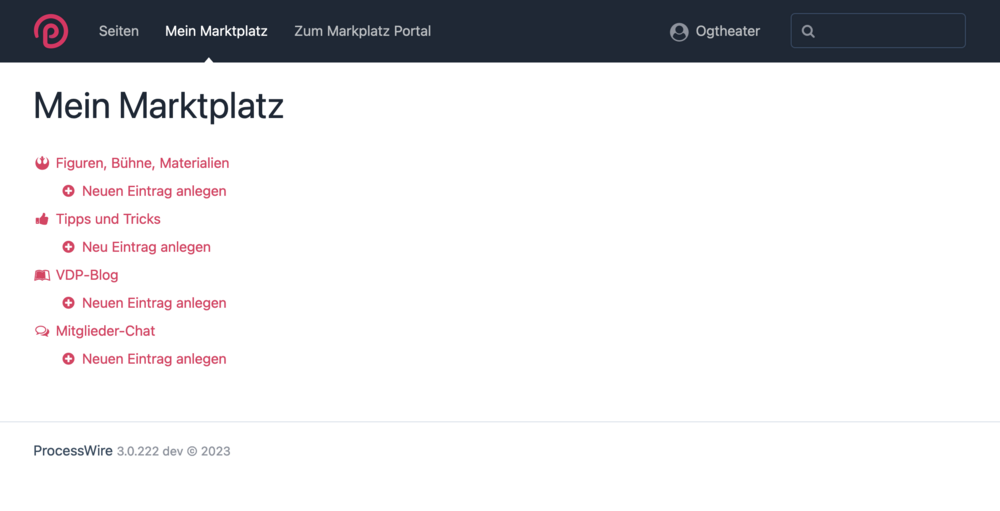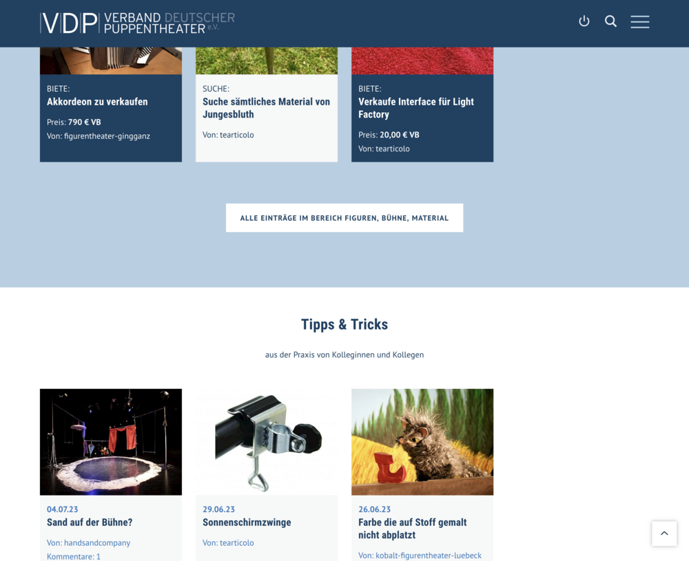 Hi, What's it all about I'd like to share some thoughts and approaches i took to meet the customers requirements when i built the website. Maybe someone has (or will have) similiar needs and can benefit from it, hopefully. I will focus mostly on technical stuff. And because of that i am not sure, if the showcase section is the place to post it (?). Its more like a testimonial. About the organisation/website https://vdp-ev.de (german language only) The Verband Deutscher Puppentheater e.V. (VDP) is the cultural policy respresentation for professional puppet stages in Germany. The VDP gives advice, shares knowledge and represents currently 140 member stages. They publish a magazine frequently, giving awards, workshops and organize events for their members. As the VDP was founded many years ago, they have lots and lots of contents, each with individual structural needs . So the first goal was to pack the vast of content in a good structure and make sure visitors has access to it as straight as possible. Therefor the grafical presentation is rather plain, not really stand out or comes with fancy stuff ?. Some random screens of the public website: Some random screens of the (secured) members marketplace (explanation s. below): Seeing no way to set skip links, here is a short plain TOC: 1. Building a marketplace for VDP members 1.1 Requirements and conceptual thoughts 1.2 Building the menu 1.3 Keep it maintainable 2. Publish selected members content on the public website 2.1 Clients request 2.2 Starting, first approach 2.3 Solution 1. Building a marketplace for VDP members 1.1 Requirements and conceptual thoughts Before the relaunch, members (they have a special user role) yet could login into the backend and edit their contents (data for their stage + add/edit productions). With help of @adrians AdminRestrictBranch they only see their own stage and productions. Those users have no access to other menu trees. With the relaunch the VDP wants to have something different/more elaborated: A secured member area (e.g. marketplace) where all members can share and swap ideas, informations, leading discussion related to their profession, offer or search for profession related material (like puppets, technical gear, services etc.) and some more. Just like some kind of a simple forum (with maintaining their own entries, s. below), but without the overhead of a standalone forum software. There was a (only grafical) approach how to do this by the former developer. His idea was to establish a secured member frontend where the loggedin user have (frontend) presentations to manage their own marketplace content, their stage and productions and even their profile a least. Well, some kind of reinventing the backend... Beside the fixed budged, i thought of a better way to do this. First, i wanted to seperate the marketplace output from the input strictly. Without real advantage member users shouldn't be forced to learn something they're already familiar with (Backend login and add/edit their stage and productions). Second, all marketplace content should live within the PW ecosystem, e.g. are template base pages that lives in the page tree. At least for administrators to see/edit... (s. below also). So, where to establish the CRUD actions for the members content of the marketplace section for each member user (with that special user role)? It all leads to adapt the PW Backend Menu. The Module CustomAdminMenus by @Robin S seems to give a good start for this. The setup for static pages is rather simple. But for my use case i had to deal with a much more dynamic approach. Luckily the module is hookable... I wanted to have two Menus: Mein Markplatz which displays all CRUD actions for the sections (Figuren, Bühne, Material, Tipps & Tricks a.s.o., s. image above) and Zum Markplatz Portal which links to the members marketplace overview page. 1.2 Building the menu First we get the current user content, populate the dynamic menu and build two menus at least. /** * Build Marketplace Admin Menu * * Backend interface for vdp members to add/edit pages marketplace * sections. * * Each member only will see entries that they created. */ $wire->addHookAfter('CustomAdminMenus::getMenuChildren', function(HookEvent $event) { // The menu number is the first argument $menu_number = $event->arguments(0); // Handle Menu 1 if($menu_number === 1) { // Get the current user $user = $event->wire()->user; // Hide admin menu except for vdp members if ($user->isSuperuser() || !$user->hasRole('theater')) { // Do not show the menu $event->return = false; } else { // init $hints_children = []; $offers_children = []; $blog_children = []; $discussions_children = []; // Get all hints for current user $hints = $event->wire()->pages->findRaw("template=members-marketplace-hint, created_users_id=$user.id", ['title', 'url', 'id']); // Allow to add a new hint // Adapt values to fit your environment $hints_children = [ [ 'icon' => 'plus-circle', 'label' => 'Neuen Eintrag anlegen', 'url' => $event->wire()->config->urls->root.'vdpadm/page/add/?parent_id=4232', 'newtab' => false, ] ]; // Build from results // Adapt values to fit your environment foreach($hints as $hint) { $hints_children[] = [ 'icon' => 'file-text-o', 'label' => $hint['title'], 'url' => $event->wire()->config->urls->root.'vdpadm/page/edit/?id='.$hint['id'], 'newtab' => false, ]; } // ... repeat for other marketplace sections ... // Build the menu $menu1 = [ [ 'icon' => 'thumbs-up', 'label' => 'Tipps und Tricks', 'url' => '', 'newtab' => false, 'children' => $hints_children, ] // ... repeat for other marketplace sections ..., don't forget the `,` ;-) ]; // Return the menu $event->return = $menu1; } } // Handle Menu 2 (Link to marketplace portal) if($menu_number === 2) { // Get the current user $user = $event->wire()->user; // Hide admin menu except for vdp members if ($user->isSuperuser() || !$user->hasRole('theater')) { // Do not show the menu $event->return = false; } else { $menu2 = []; // Re