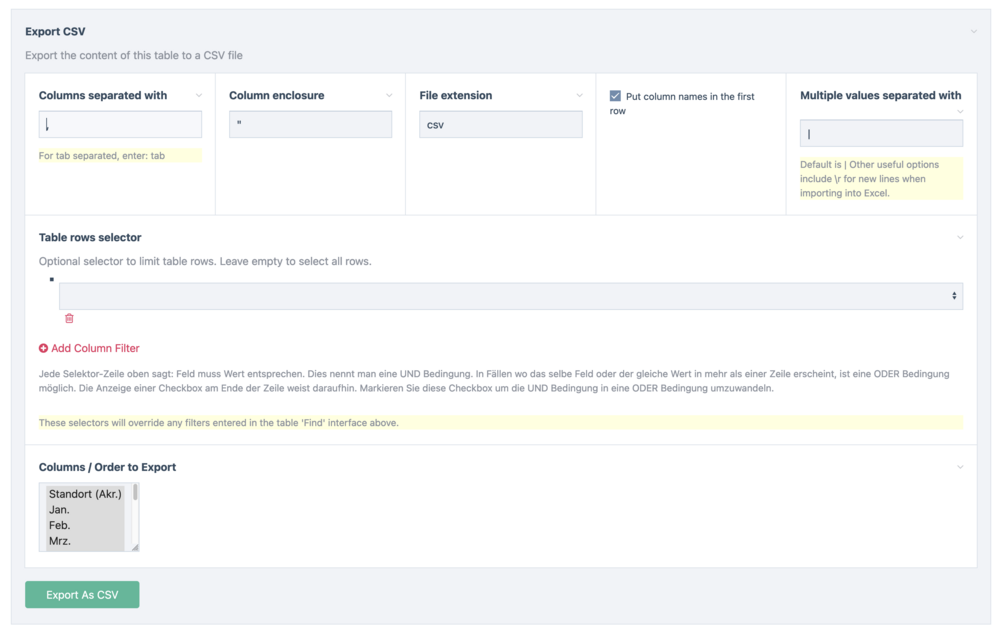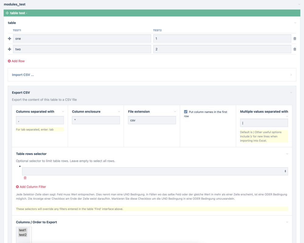 Hi @adrian, maybe i doing something wrong? Logged in as superuser, i installed the module, published the permissions and tried to export data of a existing table as a test. The interface looks a bit broken (s. below). For example i cannot add or delete Talbe rows selectors and nothing happens when i click on "Export As CSV" also. Do you have any idea, what i am missing? Cleared cache several times, logged out/in. Maybe it is a jquery core issue? Thx in advance Olaf Processwire 3.0.221 dev, ProFields Table 0.2.4, Latest Table CSV Import/Export Module (2.0.16)
