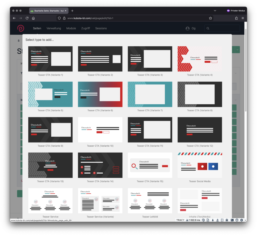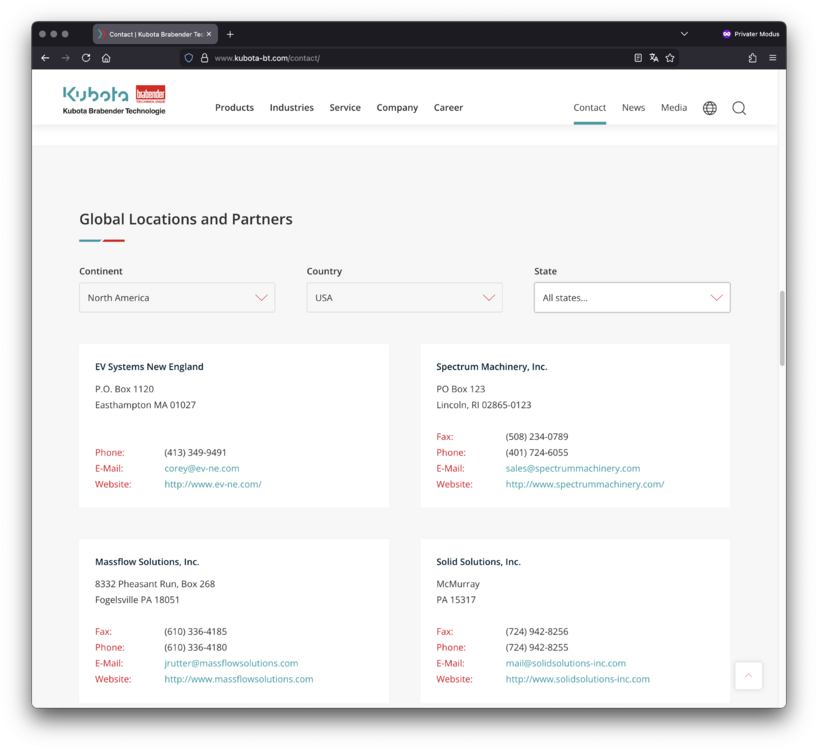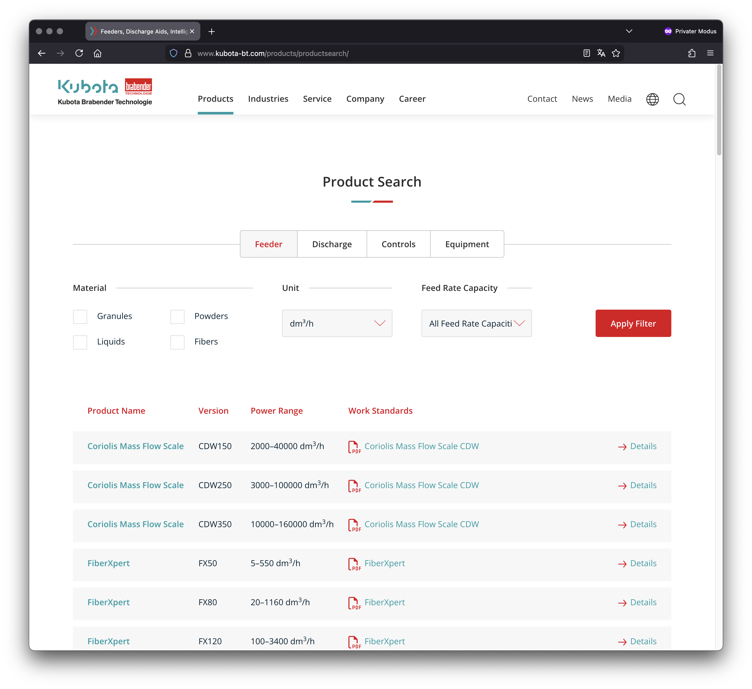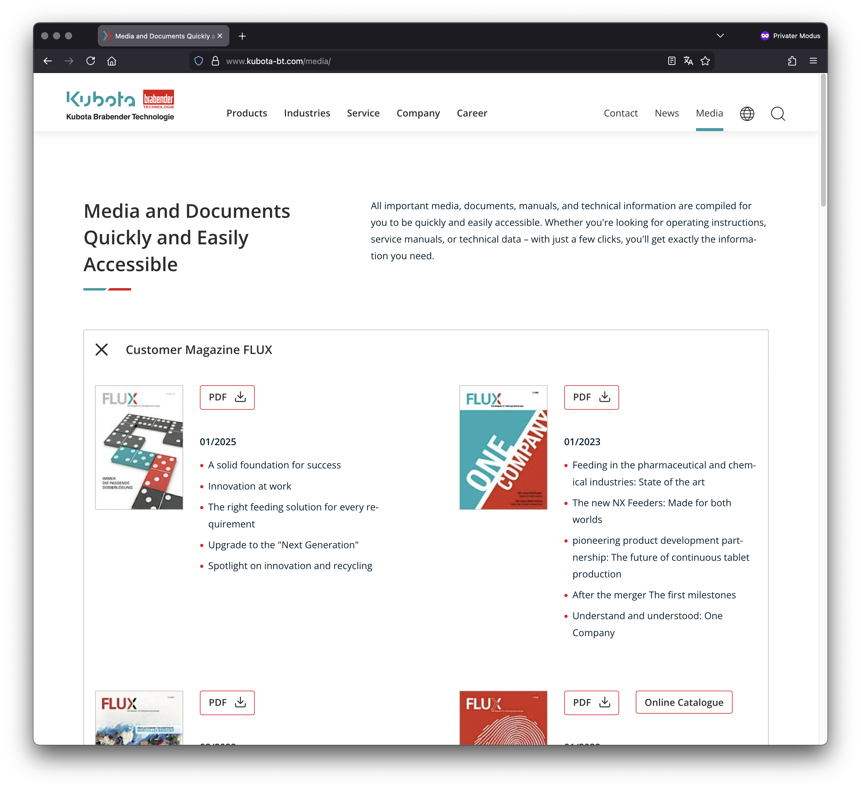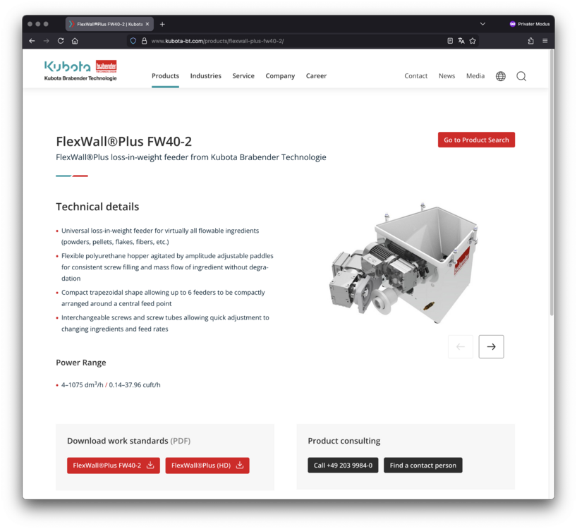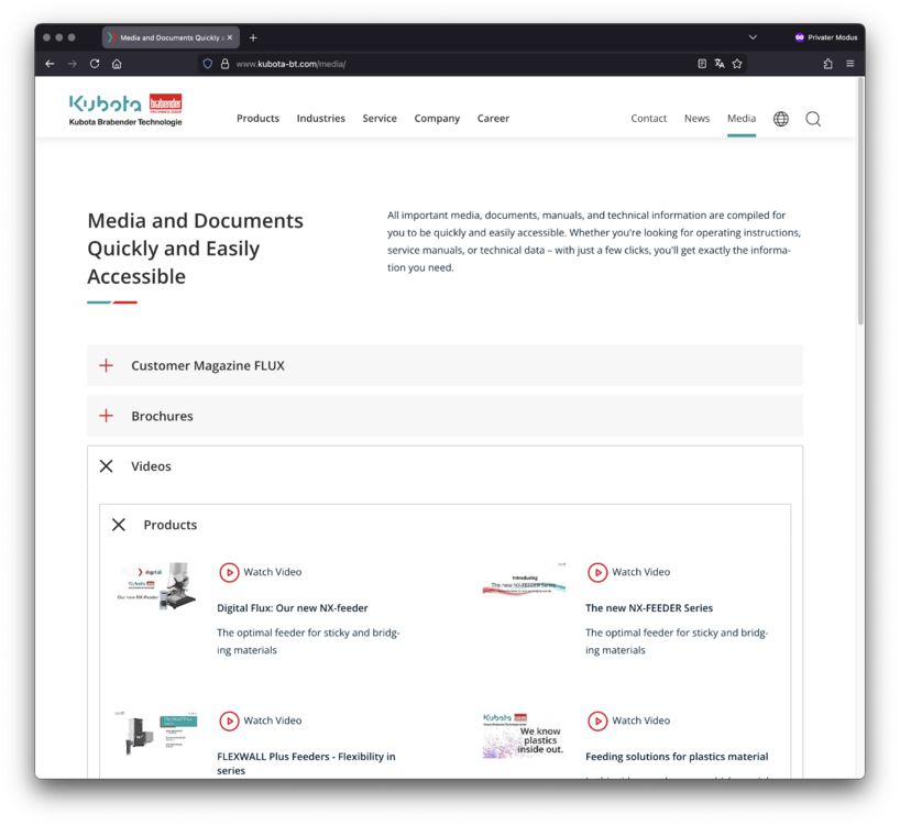 End of 2025 the relaunch of die Kubota Brabender Technology Website went live. KBT is a global leader in feeding technology and bulk solids handling. The technical production is developed by me, Olaf Gleba. The grafic design is supplied by C&G: Strategische Kommunikation GmbH. Homepage: https://www.kubota-bt.com The site uses a lot of asynchronous calls in several sections. 1. The product search is ajax driven and also preserve entered filter options while browsing the product pages (and all other pages) with session.storage. 2. Because there are many global partners and locations, it is neccessary to allow to narrow down the selection for proper contacts. 3. The page media holds all available downloads and media content. This includes magazines, videos, terms of contract and works standard specifications. The videos are implemented with help of the HTML Dialog Element. Work Standards documents are supplied/collected from one source (product page) to avoid duplication. 4. Backend: As most of the time, i provided content modules that fits the client needs. This and that: PrivacyWire (@joshua) as CCM (just a few cookies to handle Matomo and external movie content) Uses the SearchEngine Module (@teppo) to handle (multilanguage) site search Wire Mail Smtp (@horst)to deliver automated e-mails Heavy use of Fieldtype AssistedURL (Fork by @adrian) to provide language dependend, local file linking (fieldname_[de|en] approach) Distribution of concatenate/minified css and javascript is cachebusted (happens within my developement environment,- no modules (like AIOM etc.) involved). The site uses a bunch of modules provided by the ProFields Package (for example Repeater Matrix and Table Fieldtypes).
