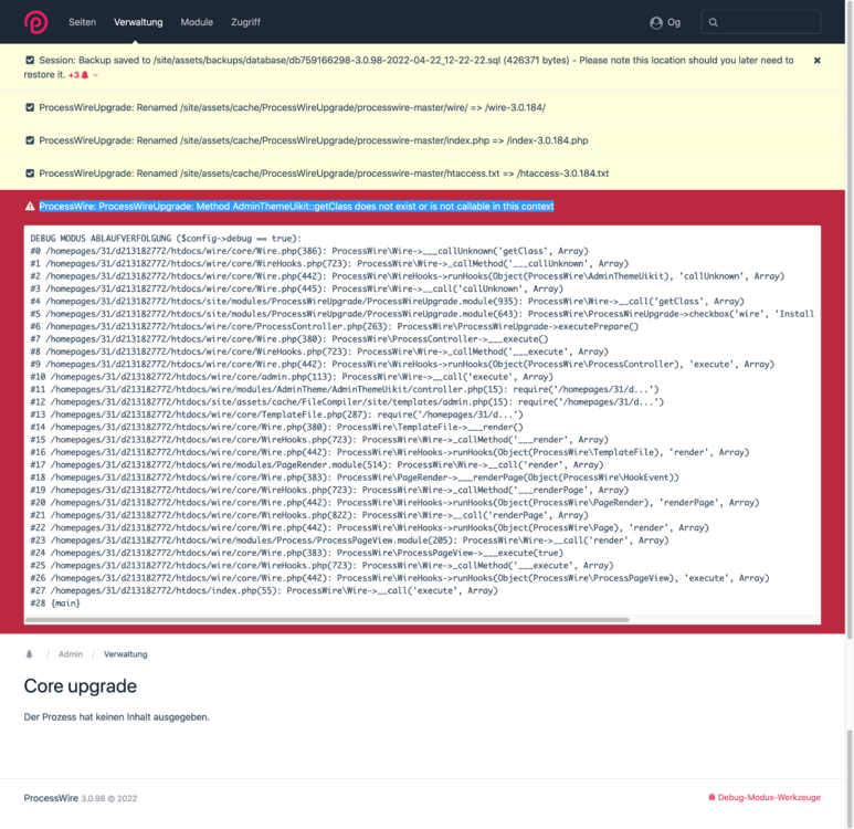 Hi, haven't seen this before: Upgrading a 3.0.98 installation breaks after second step (database backup, skip backup), s. screen below. State: Master is downloaded, Database backup done, folders are created. Modul Upgrades => last current version (1.1), cleared all possible caches twice. Any ideas? Thx in advance.