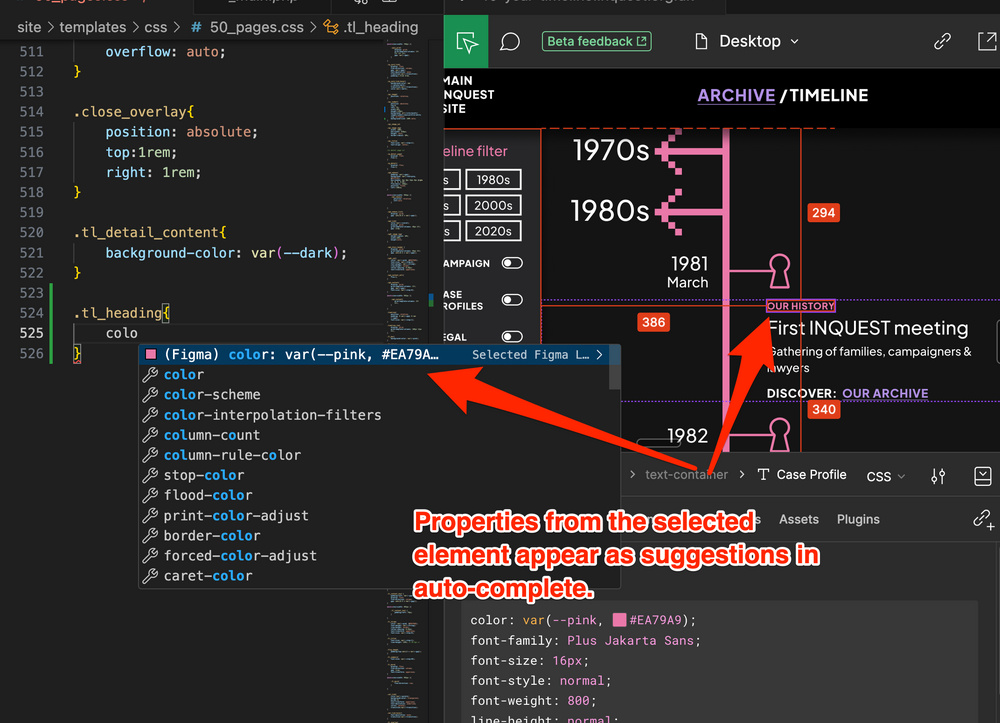 23. One thing that has improved the speed at which I can mark up a design from Figma is the VS Code extension. I can open a design in a VS Code tab, and then not only see the the properties for an element but also have them appear as auto-complete suggestions as I type. Given that mostly I'm just grabbing one or two properties for an element that's really useful. The same goes for assets; I can copy SVG elements directly to paste into my markup or export them straight into my project folder. If you use Figma and VS Code then it's definitely worth checking out.