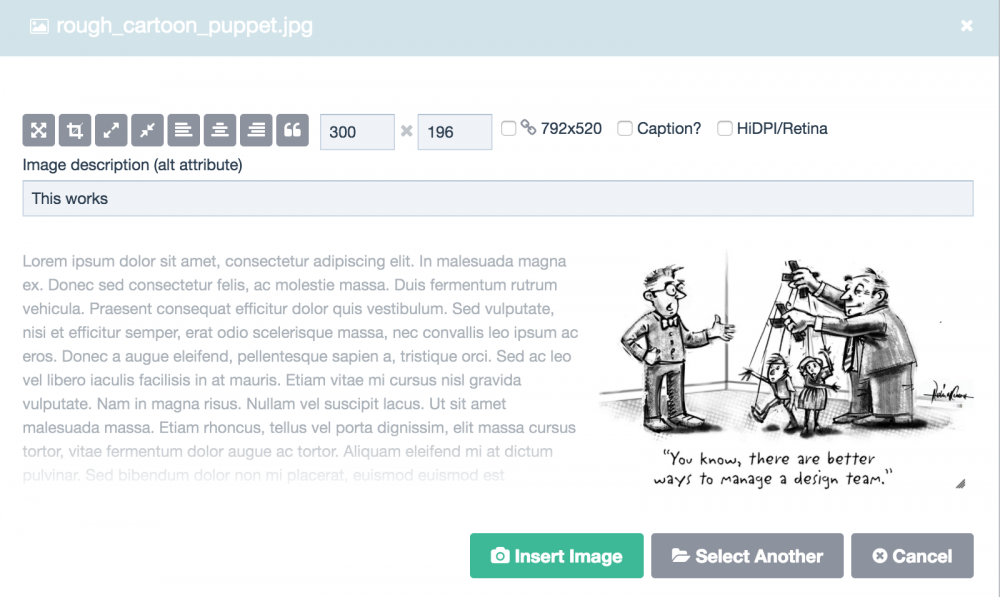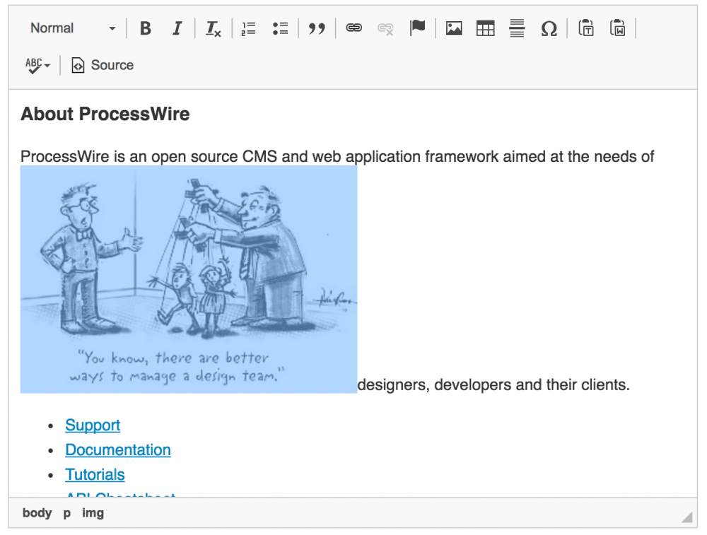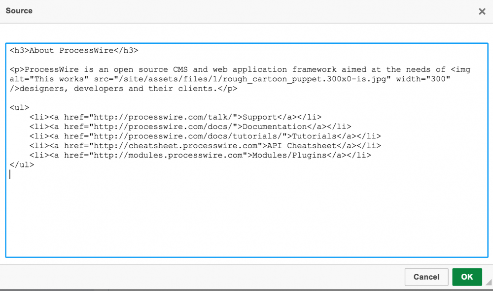As pictures speak thousand words, here it is nicely illustrated And plugin: (function() { CKEDITOR.plugins.add('pwimage', { requires: 'dialog', init: function(editor) { var pluginName = 'pwimage'; // These are the allowed and required elements & attributes for images. // It should clean all other classes but hidpi and three align classes that are generated by ProcessWire var allowed = 'img[alt,id,!src,title,width](uk-align-left,uk-align-center,uk-align-right,hidpi,align-left,align-center,align-right);' + 'a[!href];' + 'figure{width}(uk-align-left,uk-align-center,uk-align-right,hidpi,align-left,align-center,align-right);' + 'figcaption;'; var required = 'img[alt,src]';