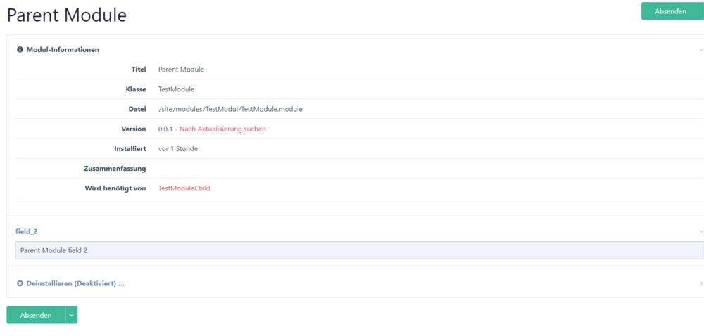 Hi, how I can access parent modules config fields? It is also not possible to use the parent methods include this fields. Example: I need field "api_user" in Child class. class Parent extends WireData implements Module { public function getApiUser() { return $this->api_user; } } class ParentConfig extends ModuleConfig { public function getInputfields() { $inputfields = parent::getInputfields(); $f = $this->modules->get('InputfieldText'); $f->attr('name', 'api_user'); $f->label = 'API User'; $f->required = true; $inputfields->add($f); return $inputfields; } } class Child extends Parent implements Module { //null $apiUser = $this->api_user; //null $apiUser = $this->getApiUser(); }