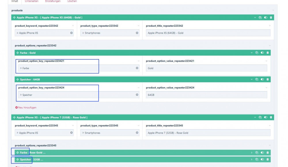 Yea, my first post. I used processwire a time, but always all questions a found in this great forum. Thanks to all members. I know, i finding a page by selector. Like this: $pages->find('template=repeater_products, check_access=0, product_keyword=' . $page->title); But, how i find all values by a field name? For example, the code below give 3 results, now i want all values from a field as array. E.g. product_option_key from my screenshot like this: [0] => Speicher [1] => Farbe At time i use the php way, like this: $productOverviewList = $pages->find('template=repeater_products, check_access=0, product_keyword=' . $page->title); $productOptionList = []; foreach ($productOverviewList as $item) { foreach ($item->product_options as $key) { if (array_key_exists($key->product_option_key->title, $productOptionList)) { $str = $productOptionList[$key->product_option_key->title] . ","; $str .= $key->product_option_value; $productOptionList[$key->product_option_key->title] = $str; } else { $productOptionList[$key->product_option_key->title] = $key->product_option_value; } } } Maybe you have a better solution for me?