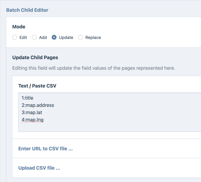 I want to update map data on City pages and I followed your instructions from here: This is how my settings in city's parent page looks like: The format of the CSV what I uploaded: City1 name,City1 name,41.88700499999999,-87.64885009999999 City2 name,City2 name,47.474851,20.5913671 City3 name,City3 name,79890229999999,20.0036779 ... After uploading the cities map data is empty. Could you help me?