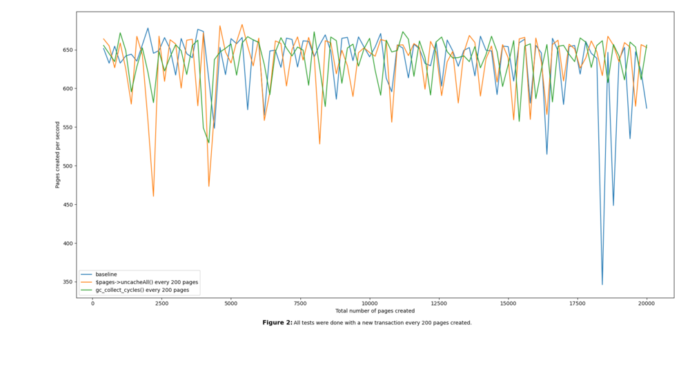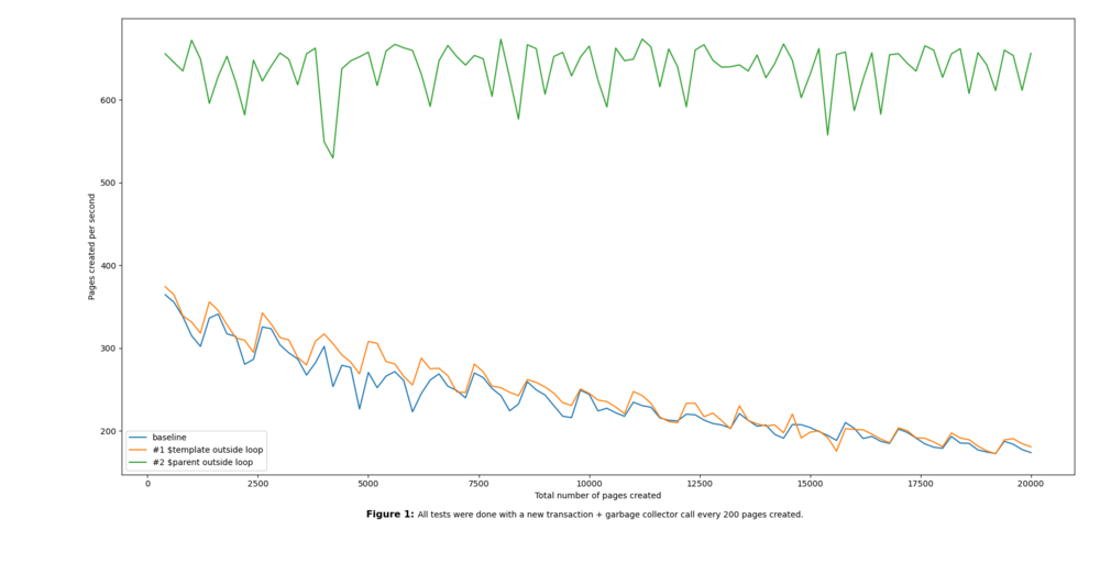 Hi, A bit of background. I am creating a website which lets you navigate through a protein database with 20 million proteins grouped into 50 thousand categories. The database is fixed in size, meaning no need to update/add information in the near future. Queries to the database are pretty standard. The problem I am currently having is the time it takes to create the pages for the proteins (right now around a week). Pages are created reading the data from a csv file. Based on previous posts I found on this forum (link1, link2) I decided to use $database transactions to load the data from a php script (InnoDB engine required). This really boosts performance from 25 pages per second to 200 pages per second. Problem is performance drops as a function of pages created (see attached image). Is this behavior expected? I tried using gc_collect_cycles() but haven't noticed any difference. Is there a way to avoid the degradation in performance? A stable 200 pages per second would be good enough for me. Pseudo code: $handle = fopen($file, "r"); $trans_size = 200 // commit to database every _ pages try { $database->beginTransaction(); for ($i = 0; $row = fgetcsv($handle, 0, " "); ++$i) { // fields from data $title = $row[0]; $size = $row[1]; $len_avg = $row[2]; $len_std = $row[3]; // create page $page = new Page(); $page->template = "protein"; $page->title = $title; $page->size = $size; $page->len_avg = $len_avg; $page->len_std = $len_std; $page->save(); if (($i+1)%$trans_size == 0) { $database->commit(); // $pages->uncacheAll(); // gc_collect_cycles(); $database->beginTransaction(); } } $database->commit(); } I am quiet new to process wire so feel free to criticize me ? Thanks in advance