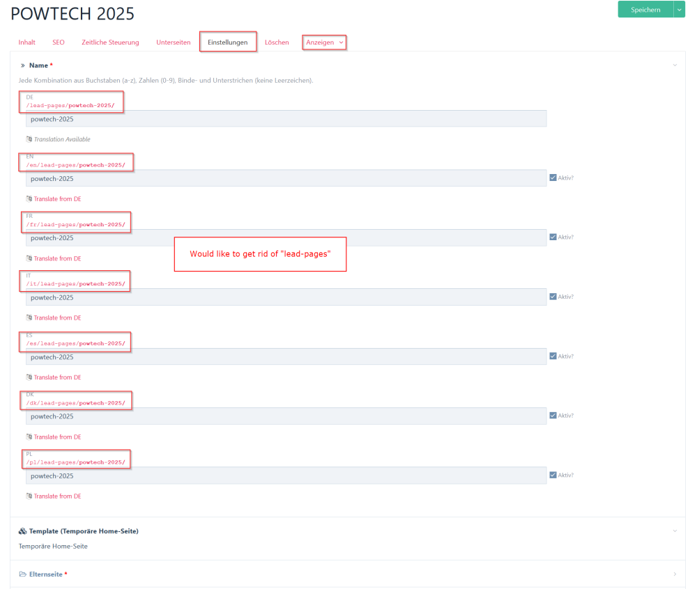 Hey @Zeka, hey @adrian, thank you for your code-examples. They seem to work pretty well for me! However, I have discovered a strange problem that I can't explain. Maybe one of you knows what I have to do to get the corrected link displayed on the actual page in the backend. I'll try to clarify it with 2 screenshots: In the page-tree the link is correct: but not on the edit screen: This is my code in ready.php: $pages->addHookAfter("Page(template=product-item|home-temp)::path", function (HookEvent $e) { $page = $e->object; $pages = wire('pages'); $user = wire('user'); $language = $user->language; $langSegment = $pages->get("/")->localPath($language); $pageName = (!empty($page->localName($language))) ? $page->localName($language) : $page->name; // Products if ($page->matches("has_parent=products")) { $parent=$pages->get('name=products')->parent->localName($language); $e->replace = true; $e->return = $langSegment . "$parent/$pageName/"; } // Lead-Messe if ($page->parent->matches("name=lead-pages")) { $e->replace = true; $e->return = $langSegment .$pageName.'/'; } }, array('priority'=>101)); Any ideas? EDIT: To clarify my question: Which hook can I use to change these links?