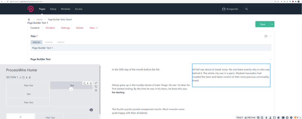 Here is the first very early concept of a Page Builder. As per the conversation in the 'ProcessWire beyond 2021' conversation, I set myself a challenge to make a clone of YOOtheme Pro's Page Builder. This was mainly spurred by @Jonathan Lahijani's excellent overview of ideas of a page builder for ProcessWire. This is still in very early stages and I am not really sure where it is headed. I would like to hear the thoughts of like-minded persons ?. I would especially love to hear from @Jonathan Lahijani, @szabesz, @AndZyk and @flydev ?? please. Concept The page builder in its current state is a Fieldtype + Inputfield supported by other behind-the-scenes Fieldtypes without Inputfields. There are no hidden or extra pages in contrast to Repeater Matrix. All values are stored in the Page Builder fields for the page being edited. The fields do not store values as JSON. Definitions for elements, rows, grids, etc as stored as JSON. Currently, for storage purposes, 4 datatypes are supported - Text (HTML), images, plain text and headlines. From a storage perspective, the latter two are one and the same. Just texts with different 'schemas/definitions'. More on this below. The fields are multitype fields. This means one page can hold multiple texts, allowing for repeatability. Similar datatypes are stored together in one field/table. For instance, there is no reason why a (future) URL element (datatype) should not be stored in the same table as plain text. At the database level, they are both just texts with similar requirements. At the processing level, URLs vs other plain texts (headlines, etc) are handled differently (validation, sanitisation, etc). Each 'element' represents a row in a table for most types (e.g. slideshows are slightly different). Querying and access of field values is via the main Fieldtype - FieldtypePageBuilder. However, the supporting Fieldtypes can be also be accessed and queried individually, if one wishes, using normal ProcessWire selectors. The supporting Fieldtypes, if such need arises could easily become custom tables instead (but best to keep them as Fieldtypes - easier querying with selectors, etc). It is totally CSS-agnostic in relation to frontend output. You bring your own CSS. In the preview, you can also use your own CSS. In the frontend, you can choose to output raw values as you wish or use inbuilt render methods to render the whole layout for you or to render the value of an element as per its tag definition (e.g. headlines as h2, h4, etc) where applicable. Fully multilingual (although the editing UI not yet implemented). Issues The main issue is the real estate needed for InputfieldPageBuilder. Any such page builder would require the whole width of the window. As you can see from the screenshot below, this obviously throws things out of kilter with respect to the ProcessWire page edit UI, in any theme (I believe). I am not a designer so would love to hear from you about possible solutions. My current thoughts are: Modal Open the page builder in a modal for editing. Pros Would allow for use of whole real estate. Title and other fields would not be in the way. Cons Editing in modals can be tricky? Other..? Process Module Pros Solves the real estate issue. Cons Disconnect between the page being edited/created and the page tree. Screenshot No attempt has been made to theme it as per any current ProcessWire theme (that I know of). This was a quick and dirty-ish clone of YTPB. As stated, however, the current ui is not acceptable as an Inputfield for, mainly, real estate reasons. Video Demo This is a demo for the Page Builder app outside ProcessWire. Thoughts? Thanks. PS: I currently have no time to continue working on this (Padloper, etc..)