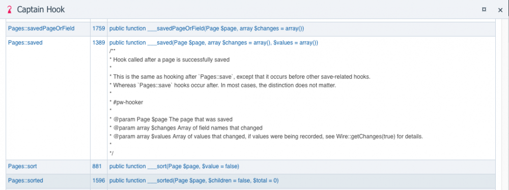 More improvements to the Captain Hook panel which I think now makes it the definitive source for browsing and understanding what each hook does. You have always been able to click the line number to open the file to the line of the method in your code editor (if you have things set up correctly), but this new version adds the following two new features: 1) Inline documentation for each hook - click method (last column) to expand/collapse the docs: 2) Direct link to PW API reference (from the Class::method link in the first column), eg clicking on "Pages::saved" will take you directly to this page: