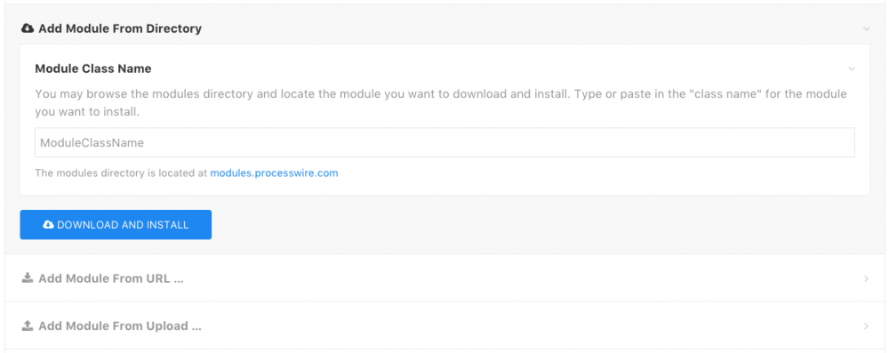 The easiest way to install modules is to install by Class Name. That will ensure the directory name is correct. If a module isn't in the modules directory, you should use the URL (to the zip), or the Upload option. The old manual unzip and move to site/modules doesn't make any sense anymore.