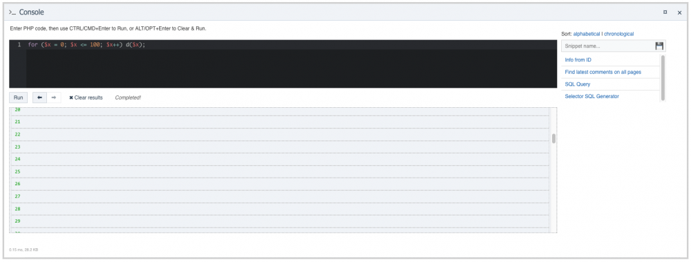 Just to clarify the bd($json) issue in case you didn't realize what is going on there. You could dump the entire json string if you wanted by using bdl() - which is a shortcut for barDumpLive(), or you could specify bd($json, 'JSON, array('maxLength' => 877) which would make the string length displayed match the length of the actual string. Note the defaults for maxLength and maxDepth are configurable in the module config setting, but these can dramatically slow down rendering, so generally recommended to leave as is and supply in the bd() statement when you need to override. Regarding the console panel - please open your browser console and let us know if you have any errors there - looks like the JS isn't being loaded.