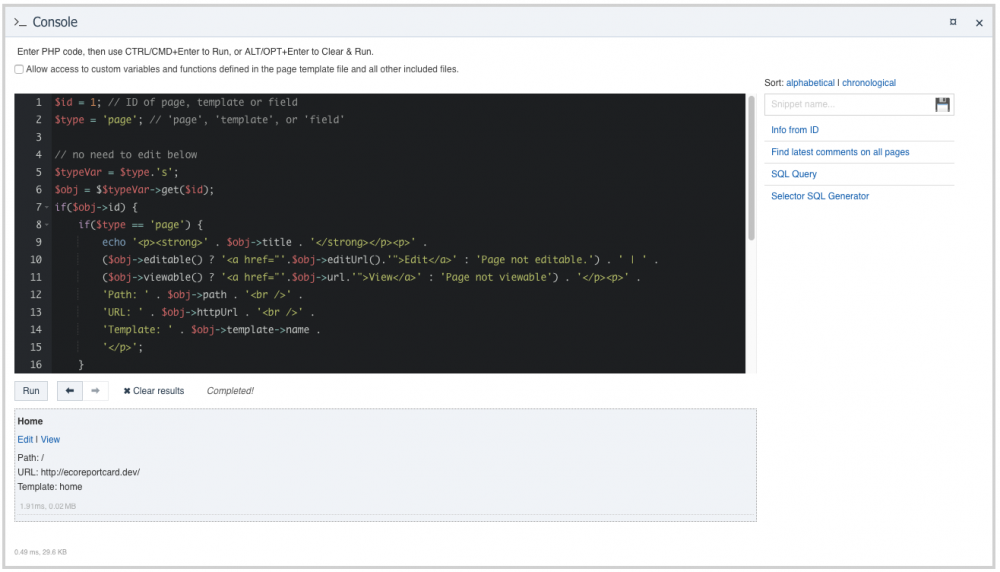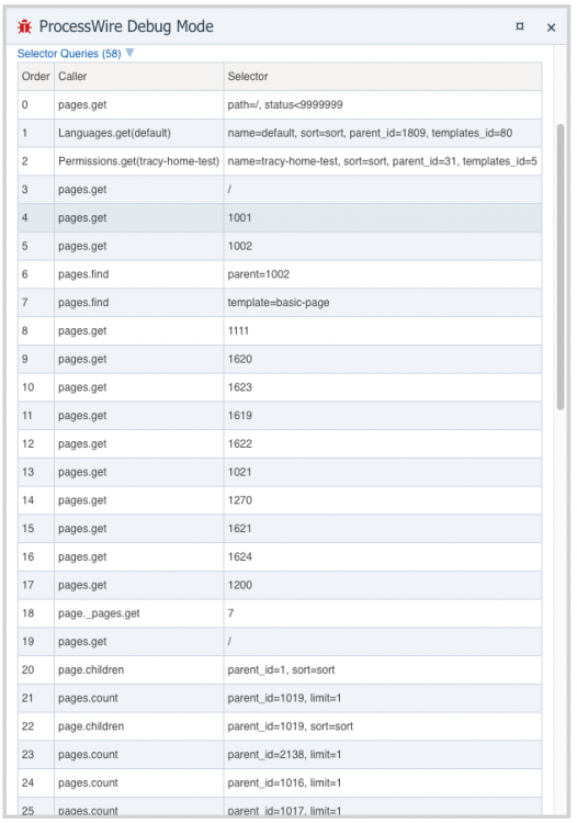 @gmclelland - latest version includes node_modules and sass-cache as default directories to exclude. On an unrelated note, I have also added a new "Selector Queries" section to the PW Debug panel. This shows you all the selector calls made during the current page load. This post also includes a Console Panel snippet idea. If you need to look up a page, template or field ID, this snippet will return the name, title, label, edit and view links, etc. Just enter the ID and the type and run. I have saved it as "Info from ID", but you can choose whatever name you want. Code included in a spoiler below.