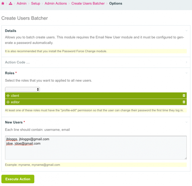 Hi everyone, To celebrate @teppo featuring this module in PW Weekly, I have added a new action: Create Users Batcher It lets you quickly create many users by entering: "username, email address" on separate lines in a textarea. This action requires the EmailNewUser module and it must be configured to automatically generate a user password. The action checks for this module and that setting before it will let you proceed. I also recommend that you install the PasswordForceChange module to reduce the risks of having emailed a password to a user. You can set multiple roles to be added to each new user. Be aware that at least one of these roles must have the "profile-edit" permission so that the user has the ability to change their password when they first login. Note that EmailNewUser will report each successful user creation and email sent success. I hope that the next time you need to create several users for a new client that you'll give this a try. And of course, don't forget to send me your own actions for inclusion with the module