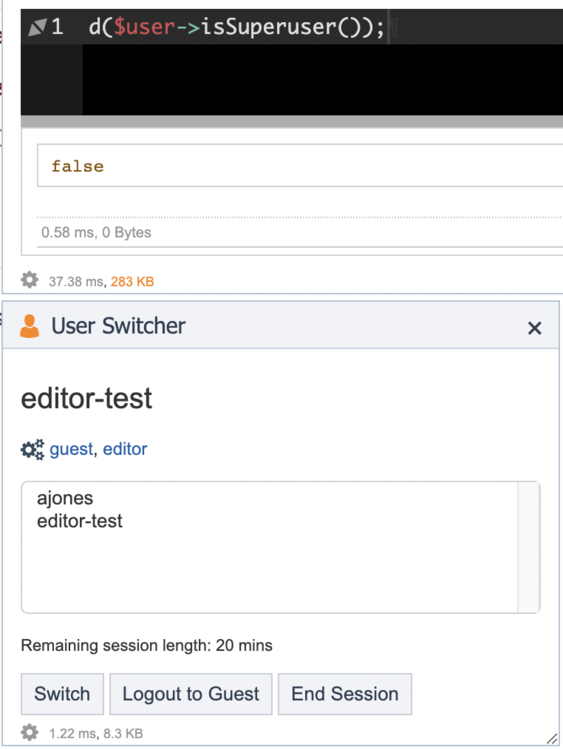 Thanks - I wasn't thinking about that Login option - yes, I think it is handy - much nicer that the core login dance :) Yeah, I suppose we could go with 41 or the first available superuser, but if I implement this, I think it would be better to use the user switcher and have the option to choose. Regarding having access to everything on the bar already - that's not quite true - I do also prevent access to Adminer in this situation. Whether I really have good justification for that or not is another question, but I do want to have a more thorough think through this moving forward to make sure I am not overlooking anything of concern.