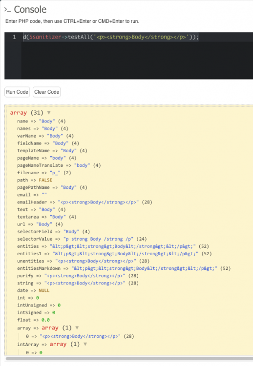 I know this is a little OT (ok, maybe a lot OT), but I just discovered the $sanitizer->testAll() option - maybe you guys all noticed it when it was introduced, but I missed it Anyway, I think it is very handy and a great use of the console panel Finding this I did notice that the list is not complete at the moment though (https://github.com/ryancramerdesign/ProcessWire/issues/2028) Anyway, hope someone finds this useful like I did!