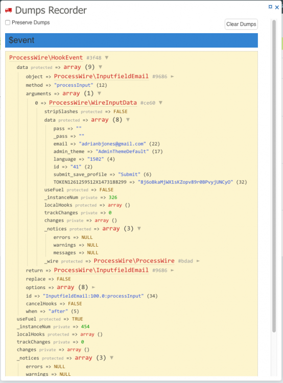 Sorry, I shouldn't give advice without really checking into it. This is what you need: $event->arguments[0]->id That will get you the id of the user/page. BTW, the way I figured this out was to bd($event) inside the validEmail() function. With TracyDebugger installed I see this: bd($event, '$event', array('maxDepth' => 5)); Then to confirm, I did this: bd($event->arguments[0]->id); and got this: With the ID you can get the full user object like this: $uid = $event->arguments[0]->id; bd(wire('users')->get($uid)); See all the user fields under "settings"