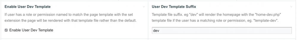 Update to the User Dev Template functionality - it is now tied into the Template Path panel so that you can have an easy visual indicator to alert you when any user is being served an alternate template. Before I explain further, the one breaking change from yesterday is that the system now only checks for "template-****" permissions and not roles. If you want to assign to a single user, then create a new "template-****" role and give it the "template-****" permission. In this screenshot, you can see the reminder detailing why the icon is orange. Currently we are not viewing a page with an alternate template, but it is letting us know that: the "User Dev Template" option is enabled in module settings the "template-dev" permission exists the permission has been assigned to at least one user there are template files with a "-dev" suffix So if this is expected then great, but if not, then you can prevent the alternate templates from being rendered by doing one or more of the following: disabling the "User Dev Template" option removing the template-dev permission from the system remove the template-dev permission from all roles delete alternate template files with the "-dev" suffix If you are on a page that is using an alternate template due to user permissions, then you will see the PW permission cog icon: I hope this visual indicator will make this functionality easier for you to manage.