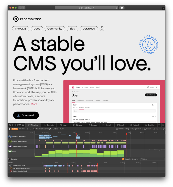 The main metric for an open-source website is converting visitors into software users. However, the main issue with the open-source adoption cycle is that there is a years-long gap between users becoming aware of the project and actually starting to use it. Overall, the goal of any rebranding is to maintain recognition while solving new challenges for the brand. The level of visual identity change for ProcessWire would be acceptable in the case of rebranding when a product has totally failed, but that's definitely not the case here. This redesign will likely result in a dramatic failure of adoption for PW among new users because they will not understand that PW is something they were familiar with before. There are hundreds of CMSs and random visitors don't remember ProcessWire by name alone, and all visual branding on the new website has no brand consistency from the dozen years of the previous PW website. The new website (as commenters in other threads noticed) simply "hey what happened to my browser bookmarks, it‘s not PW." It's hard to provide suggestions without understanding what goals the new web design is solving, but I can recommend at least changing the German interface on the first screen to a screenshot with skyscrapers, because they were there all along and are strongly associated with PW even through new designs. @ryan, please don't take my word for it and instead look at the metrics. Something like PW downloads or PW module downloads per month compared with the same period in the previous year should show the real effect of this redesign. Update: there are some performance issues that result in over 200% CPU overload on the first page.