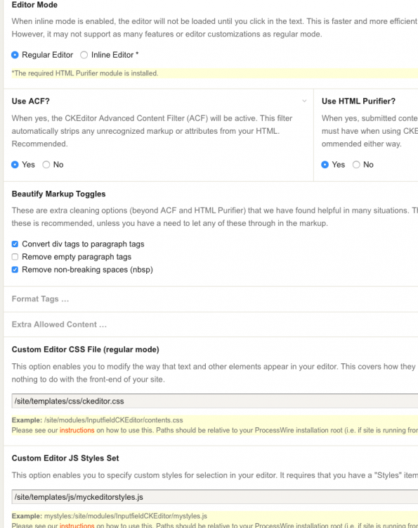 This question has probably been beaten to death - think I'm approaching this wrong. Anyway, I've got a textarea input field that uses ckeditor. Under the fields Input section I managed to add my custom style sheet in the 'Custom Editor CSS File (regular mode) section for instance: /site/templates/css/ckeditor.css This seems to work fine. What I'm trying to do now is add a custom style to the ckeditor styles menu, for instance, called .green_button (p.s. in the ckeditor styles.js I added this to the inline section : { name: 'Green Button', element: 'a', attributes: { 'class': 'button' } }, Ok, onto the problem... I notice that PW, by default, is using /wire/modules/inputfield/inputfieldCKEditor/ckeditor-4.5.10/styles.js So, I copied this into /site/templates/js/mystyles.js Next, I added the above to the 'Custom Editor JS Styles Set' field, however, it doesn't seem to load myckeditorstyles.js -- rather continues to load the one from the /wire/modules... folder. I cleared all history and caching in Safari (also tried Chrome, etc). I'm wondering if there is something else I need to do to have PW load my /site/templates/js/myckeditorstyles.js instead of the one in /wire/modules.../ckeditor-4.5.10/styles.js ? Thanks!