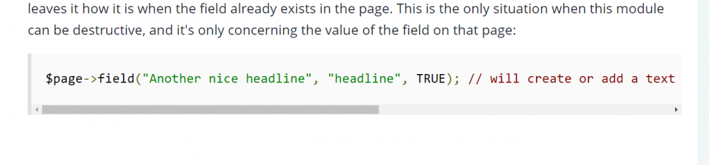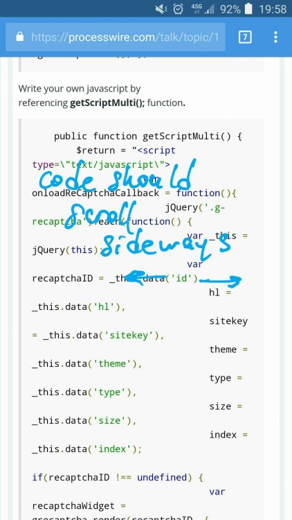 Code snippets are very hard to read on small screens due to lack of white-space: pre CSS property on <pre> tags. This causes very weird text wrapping. Adding this allows code to scroll sideways, which also preserves the whitespace properly. Here's the problem and proposed change in action Readable on large screens, overflow works ✓ Unreadable on small screens, text should not wrap ✘ Proposal: add white-space: pre on <pre> elements. See it in action 2017-04-05_20-18-03.mp4 (770KB) or GIPHY link