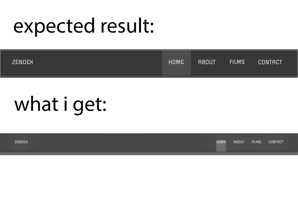 Hi, I am trying to make a site for a studio, and I wanted to set a specific hover effect for my text. I want the background of the text to be lit up in the full height of the nav bar but it doesn't do it. I showed the expected result in the png in the attached files. I will also set the code here below, the top part is a css reset. HTML: <!doctype html> <html> <head> <meta charset="UTF-8"> <title>Zendex</title> <link href="style.css" rel="stylesheet" type="text/css"> <link rel="preconnect" href="https://fonts.gstatic.com"> <link href="https://fonts.googleapis.com/css2?family=Offside&display=swap" rel="stylesheet"> </head> <body> <div id="nav_bar"> <div id="Zendex">ZENDEX</div> <ul> <a href="contact.html"><li>CONTACT</li></a> <a href="films.html"><li>FILMS</li></a> <a href="about.html"><li>ABOUT</li></a> <a href="home.html"><li>HOME</li></a> </ul> </div> <div class="main"></div> </body> </html> CSS: @charset "UTF-8"; /* CSS Document */ html, body, div, span, applet, object, iframe, h1, h2, h3, h4, h5, h6, p, blockquote, pre, a, abbr, acronym, address, big, cite, code, del, dfn, em, img, ins, kbd, q, s, samp, small, strike, strong, sub, sup, tt, var, b, u, i, center, dl, dt, dd, ol, ul, li, fieldset, form, label, legend, table, caption, tbody, tfoot, thead, tr, th, td, article, aside, canvas, details, embed, figure, figcaption, footer, header, hgroup, menu, nav, output, ruby, section, summary, time, mark, audio, video { margin: 0; padding: 0; border: 0; font-size: 100%; font: inherit; vertical-align: baseline; } article, aside, details, figcaption, figure, footer, header, hgroup, menu, nav, section { display: block; } body { line-height: 1; background-color: #6A6969; } ol, ul { list-style: none; } blockquote, q { quotes: none; } blockquote:before, blockquote:after, q:before, q:after { content: ''; content: none; } table { border-collapse: collapse; border-spacing: 0; } /*-------------------------------------------------------------------------------------------------------------------------------------------------*/ #nav_bar{ overflow: hidden; position: fixed; top: 0; width: 100vw; height: 125px; background-color: #484848; border: solid 1px black; } li{ font-size: 24px; text-shadow: 1px 1px 100px white; font-family: 'Offside', cursive; float: right; margin: 45px 50px 0px 0px; height: 125px; } #Zendex{ font-size: 24px; text-shadow: 1px 1px 100px white; font-family: 'Offside', cursive; float: left; margin: 45px 0px 0px 100px; color: azure; } #home{ } #about{ } #films{ } #contact{ } ul{ margin: 0px 50px 0px 0px; color: azure; height: 125px; } a:link{ color: white; } li:hover{ height: 125px; background-color: #6A6969; color: white; }