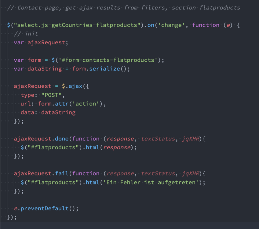 Hi, here is a task thats new to me. And obviously i overlook some basics. So maybe someone is so kind to give me some advice on this... I have a page whichs collects some contact boxes straight away on page load. It is a multilanguage Site (default is in German, the screenshots shows the english version). The results are wrapped in a form, because the user is able to narrow the resulting contacts by a page reference language switcher (values are part of every contact entry)*. This is done with a javascript ajax request to avoid page reloads. TL;DR: While everything is fine on page load, as soon as i select a country to get the related contact boxes by a ajax call, the static translated strings within the target PHP file are not recognized, e.g. their translation fails. I assume i simply miss some basics here what and when things get parsed when doing such asynchron call. *) The language switcher values has nothing to do with the choosen user language. And for the brave ones... On Page load: The highlighted areas are static translated strings (s. below). All is fine on page load (whatever current user language). If the user selects a country within the language switcher, the form in submitted per JS, do a ajax call and query the results by the giving value of the select option (more details s. below). The result is valid and looks like this (here i narrowed the result to contacts related to germany): BUT: As you can see, the static translation strings (s. highlighted areas) are not translated (e.g. use the default site language). To give a brief overview how its done, here some excerpt screens. Form tag with action target: Javascript: And here is the processing target PHP file (excerpt): contacts-flatproducts.php Many thanks in advance, Olaf
