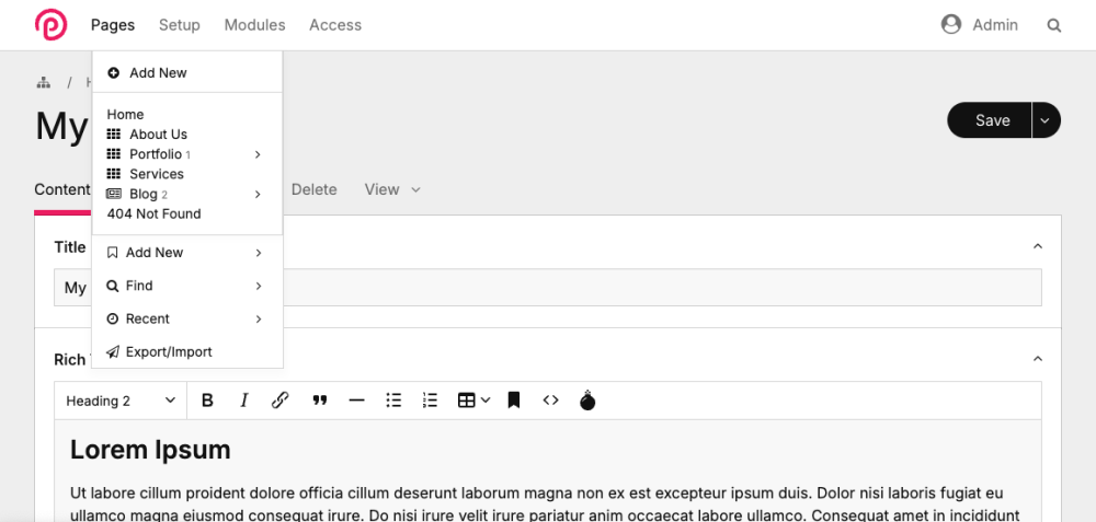 AdminQuickTree This module is great for productivity when editing many pages within the admin, as it gives you direct access to the page tree navigation without having to hover the tree icon first. Download from Github Donwload fom Module Directory For non-superusers the page dropdown currently looks like this (if no bookmarks are defined): With this module it looks like this: For super-users or users with all permissions set it looks like this: These changes are achieved width a small js file that triggers the ajax tree navigation after the dom has been loaded. While I have tested it already a bit, I release this for now as a beta version. I hope others find it useful as well.