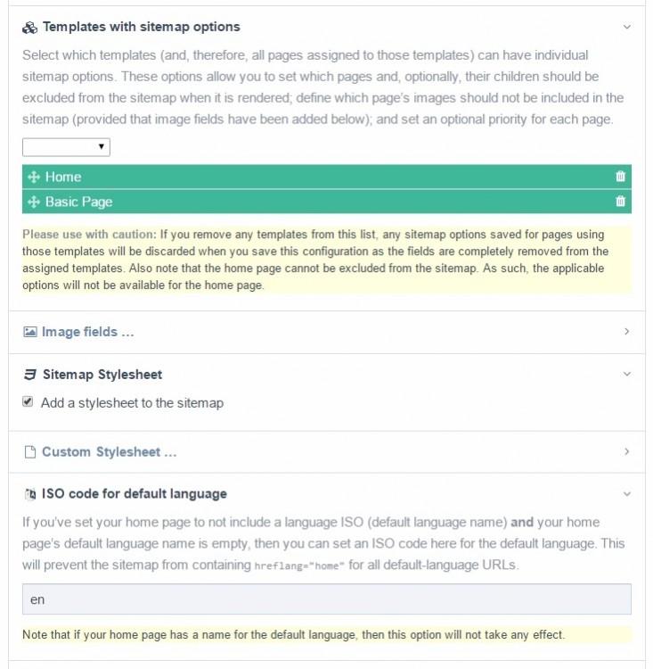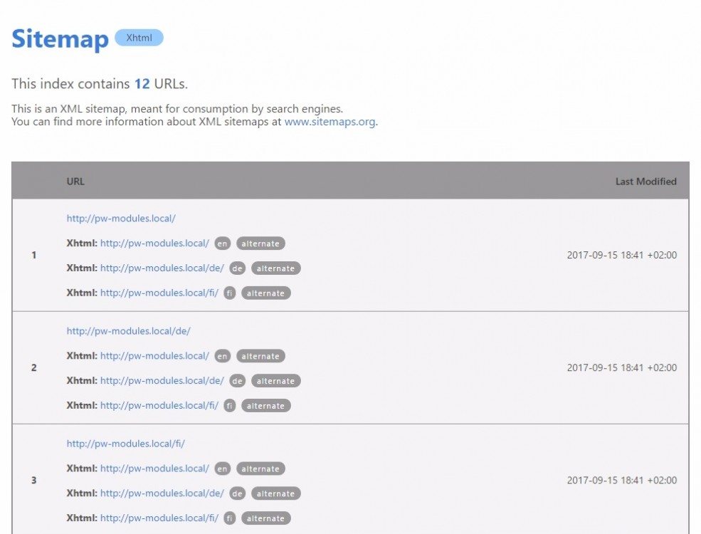 Modules Directory: MarkupSitemap Composer: rockett/sitemap ⚠️ Archived: This module is archived as nobody has offered to take it over. Feel free to fork it if you would like to take it over. MarkupSitemap is essentially an upgrade to MarkupSitemapXML by Pete. It adds multi-language support using the built-in LanguageSupportPageNames. Where multi-language pages are available, they are added to the sitemap by means of an alternate link in that page's <url>. Support for listing images in the sitemap on a page-by-page basis and using a sitemap stylesheet are also added. Example when using the built-in multi-language profile: <url> <loc>http://domain.local/about/</loc> <lastmod>2017-08-27T16:16:32+02:00</lastmod> <xhtml:link rel="alternate" hreflang="en" href="http://domain.local/en/about/"/> <xhtml:link rel="alternate" hreflang="de" href="http://domain.local/de/uber/"/> <xhtml:link rel="alternate" hreflang="fi" href="http://domain.local/fi/tietoja/"/> </url> It also uses a locally maintained fork of a sitemap package by Matthew Davies that assists in automating the process. The doesn't use the same sitemap_ignore field available in MarkupSitemapXML. Rather, it renders sitemap options fields in a Page's Settings tab. One of the fields is for excluding a Page from the sitemap, and another is for excluding its children. You can assign which templates get these config fields in the module's configuration (much like you would with MarkupSEO). Note that the two exclusion options are mutually exclusive at this point as there may be cases where you don't want to show a parent page, but only its children. Whilst unorthodox, I'm leaving the flexibility there. (The home page cannot be excluded from the sitemap, so the applicable exclusion fields won't be available there.) As of December 2017, you can also exclude templates from sitemap access altogether, whilst retaining their settings if previously configured. Sitemap also allows you to include images for each page at the template level, and you can disable image output at the page level. The module allows you to set the priority on a per-page basis (it's optional and will not be included if not set). Lastly, a stylesheet option has also been added. You can use the default one (enabled by default), or set your own. Note that if the module is uninstalled, any saved data on a per-page basis is removed. The same thing happens for a specific page when it is deleted after having been trashed.
