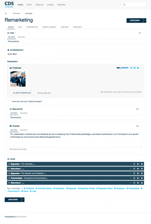The CDS Group is an established service partner of leading manufacturers and trading partners in the IT and high-tech sector. We relaunched their service website using the latest ProcessWire. Building this website was fun, especially because of the latest additions to ProcessWire, like the recently introduced markup regions and AdminThemeUIkit. It is really easy to brand the new admin theme with a few lines of code, in my case 7 (see a glimpse in the screenshot below). Besides that, this website makes heavy use of the Repeater Matrix, to be as flexibel as possible. The front-end was build with Bootstrap 3 and the icons used are an custom icon font generated with the IcoMoon App. For a better usability, every textarea can be edited in the front-end. www.cds-service.com Modules used: AdminThemeUIkit Front-End Page Editor Repeater Matrix ProCache Markup Sitemap XML Email Obfuscation (EMO) Database Backups Jumplinks Tracy Debugger Regards, Andreas